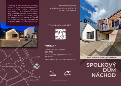 Modern%u00cc prostorpro komunitn%u00cc a kulturn%u00cc%u017eivot v N%u00e1chod%u011bSPOLKOV%u203a D%u016eMN%u00a3CHODnov%u00c8 centrum spolkov%u02ddch aktivitP%u0159ehled kulturn%u00edch akc%u00ed:Hurd%u00e1lkova 2171, N%u00e1chod8:00%u201317:00michal.hornych@mestonachod.cz724 141 302www.mestonachod.cz/spolkovy-dumKONTAKTSpolkov%u00fd d%u016fm v N%u00e1chod%u011b, otev%u0159en%u00fd v roce 2024, navr%u017een%u00fd architektonickou kancel%u00e1%u0159%u00ed Tom%u00e1%u0161 Vymet%u00e1lek Architects, s.r.o.%u00a0 z%u00a0 Hradce Kr%u00e1lov%u00e9, stoj%u00ed na m%u00edst%u011b b%u00fdval%u00e9 hasi%u010dsk%u00e9 zbrojnice zvan%u00e9 Hurd%u00e1lk%u016fv d%u016fm, kter%u00fd byl postaven v 19. stolet%u00ed na m%u00edst%u011b rodn%u00e9ho domu biskupa a n%u00e1rodn%u00edho buditele Josefa Franti%u0161ka Hurd%u00e1lka.Hurd%u00e1lkova 2171 foto: archiv m%u011bsta N%u00e1chodlavi%u010dkaJosefa %u0160kvoreck%u00e9hoMasarykovo n%u00e1m%u011bst%u00edKarlovo n%u00e1m%u011bst%u00edKamenice