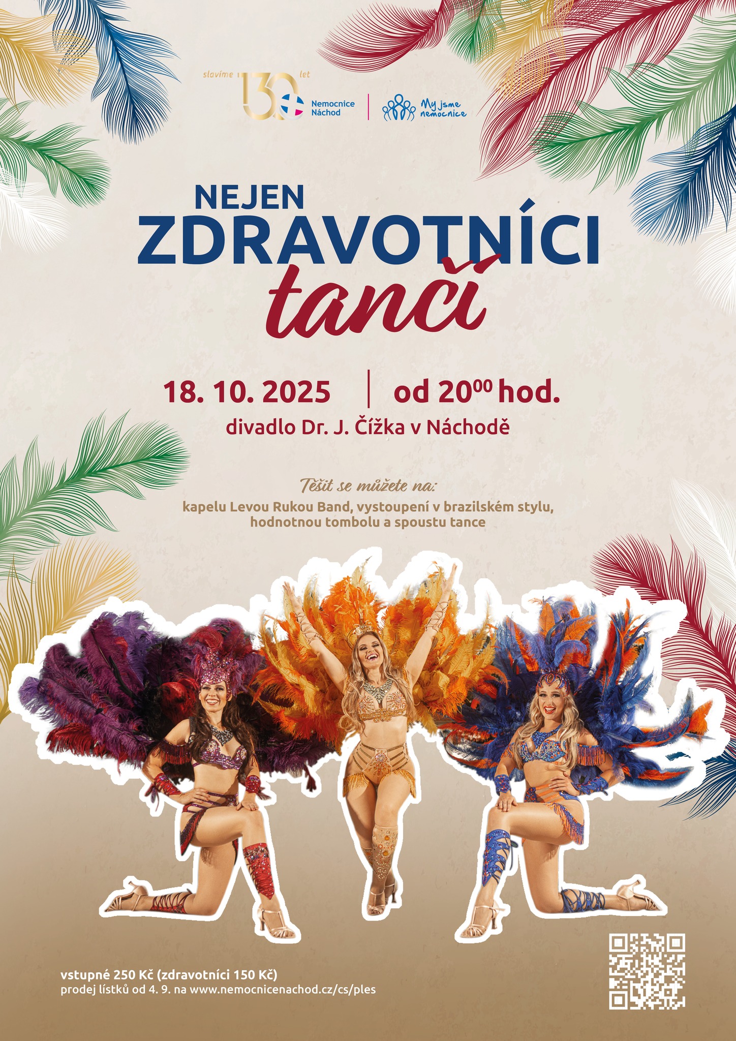 Oblastní nemocnice Náchod, a.s. zve v sobotu 18. října 2025 od 20:00 všechny zdravotníky i další milovníky dobré hudby a tance do Městského divadla Dr. J. Čížka na ples „Nejen zdravotníci tančí".