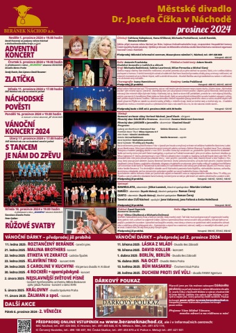 P%u0158EDPRODEJ ONLINE VSTUPENEK na www.beraneknachod.cz, ale i v%u00a0Informa%u010dn%u00edch centrech:MIC N%u00e1chod, tel.: 491 426 060, IC Hronov, tel.: 491%u00a0483%u00a0646, IC N. M%u011bsto n. Met., tel.: 491 472%u00a0119,IC%u00a0%u010cerven%u00fd Kostelec, tel.: 498%u00a0100%u00a0657, RIC %u010cesk%u00e1 Skalice, tel.: 491 453%u00a0870 a IC Police n. Metuji tel.: 491 421 501BER%u00c1NEK N%u00c1CHOD a.s. prffl inec 2024 M%u011bstsk%u00e9 divadlo Dr. Josefa %u010c%u00ed%u017eka v%u00a0N%u00e1chod%u011bDAL%u0160%u00cd AKCEP%u00e1tek 6. prosince 2024 - 2. V%u011aNE%u010cEK Ned%u011ble 1. prosince 2024 v 19.00 hodinDavid Novotn%u00fd za podpory m%u011bsta N%u00e1chod a Kr%u00e1lov%u00e9hradeck%u00e9ho kraje po%u0159%u00e1d%u00e1ADVENTN%u00cd KONCERT%u00da%u010dinkuj%u00ed: Sv%u011btlana N%u00e1lepkov%u00e1, Hana K%u0159%u00ed%u017ekov%u00e1, Michaela Pech%u00e1%u010dkov%u00e1, Luk%u00e1%u0161 Rand%u00e1k, Renata Dr%u00f6sslerZ%u00e1%u0161titu p%u0159ijali starosta m%u011bsta N%u00e1chod Jan Birke, hejtman Kr%u00e1lov%u00e9hradeck%u00e9ho kraje, viceprezident Hospod%u00e1%u0159sk%u00e9 komory %u010cesk%u00e9 republiky Radek Jakubsk%u00fd. V%u00fdt%u011b%u017eek je v%u011bnov%u00e1n do M%u011bstsk%u00e9ho st%u0159ediska slu%u017eeb Marie N%u00e1chod a neziskov%u00e9 organizace Stacion%u00e1%u0159 Cesta v%u00a0N%u00e1chod%u011b.P%u0159edprodej: M%u011bstsk%u00e9 informa%u010dn%u00ed centrum, Masarykovo n%u00e1m%u011bst%u00ed 1, N%u00e1chod, tel.: 491 426%u00a0060Vstupn%u00e9: 400 K%u010d%u010ctvrtek 5. prosince 2024 v%u00a019.00 hodin4. p%u0159edstaven%u00ed v r%u00e1mci %u201eZELEN%u00c9HO%u201c abonm%u00e1 2024/2025Divadlo Metro PrahaSandy Rustin, Dan Lipton a David Rossmer: ZLAT%u00cd%u010cKARe%u017eie: Anton%u00edn Proch%u00e1zka P%u0159eklad a %u010desk%u00e9 texty:%u00a0Adam Nov%u00e1kHudebn%u00ed komedie o rodi%u010d%u00edch a d%u011btechHraj%u00ed: Michaela Bad%u00ednkov%u00e1, Sabina Laurinov%u00e1, Milan Peroutka a Michal Slan%u00fdZlat%u00ed%u010dka mapuj%u00ed v%u0161echny f%u00e1ze dne%u0161n%u00edho rodi%u010dovstv%u00ed, od po%u010det%u00ed potomka a%u017e po jeho odchod na vysokou %u0161kolu, a to s velkou d%u00e1vkou pochopen%u00ed a humoru. V s%u00e9ri%u00edch komick%u00fdch sc%u00e9nek a hudebn%u00edch %u010d%u00edsel herci brav%u016frn%u011b provedou div%u00e1ky plusy a minusy rodi%u010dovstv%u00ed, od kr%u00e1sn%u00fdch moment%u016f a%u017e po ty %u0161%u00edlen%u00e9. Vtipn%u00e9, sv%u011b%u017e%u00ed a z%u00e1m%u011brn%u011b neuctiv%u00e9... Muzik%u00e1l Zlat%u00ed%u010dka zaru%u010duje sladkobolnou radost z rodi%u010dovstv%u00ed, a to za zlomek ceny rovn%u00e1tek...Choreografi e:%u00a0Ivana Hannichov%u00e1 Kost%u00fdmy: Lenka Pol%u00e1%u0161kov%u00e1P%u0159edprodej ji%u017e prob%u00edh%u00e1. Vstupn%u00e9: 480 K%u010d, 460 K%u010d, 440 K%u010d St%u0159eda 11. prosince 2024 v 17.00 hodin ZU%u0160 N%u00e1chod v%u00e1s zve na v%u00e1no%u010dn%u00ed po%u0159ad!N%u00c1CHODSK%u00c9 POV%u011aSTIJeliko%u017e m%u011bsto N%u00e1chod slav%u00ed sv%u00e9 770 narozeniny, tak se i n%u00e1%u0161 leto%u0161n%u00ed v%u00e1no%u010dn%u00ed koncert nese v tomto duchu. Ji%u017e jeho n%u00e1zev %u201eN%u00e1chodsk%u00e9 pov%u011bsti%u201c v%u00e1m mnoh%u00e9 napov%u00ed. Liter%u00e1rn%u011b - dramatick%u00fd obor pro v%u00e1s p%u0159ipravil 4 m%u00edstn%u00ed pov%u011bsti. U%u017eijete si jak ty historick%u00e9, kter%u00e9 opravdu zobrazuj%u00ed %u010d%u00e1st m%u00edstn%u00edch d%u011bjin (Vyhn%u00e1n%u00ed Koldy z N%u00e1choda), tak ty, kter%u00e9 se skoro bl%u00ed%u017e%u00ed poh%u00e1dk%u00e1m, proto%u017ee se v nich objevuj%u00ed bludi%u010dky, vodn%u00edci, permon%u00edci %u010di %u010darod%u011bjnice (Zlat%u00e1 sk%u00e1la na Dobro%u0161ov%u011b). Op%u011bt se samoz%u0159ejm%u011b m%u016f%u017eete t%u011b%u0161it na na%u0161e hudebn%u00ed uskupen%u00ed i s%u00f3listy, kte%u0159%u00ed pov%u011bsti dopln%u00ed kr%u00e1snou hudbou. Celkovou atmosf%u00e9ru dotvo%u0159%u00ed n%u00e1padit%u00e9 v%u00fdstupy tane%u010dn%u00edho oboru a sc%u00e9nu vizu%u00e1ln%u011b dopln%u00ed na%u0161i mlad%u00ed v%u00fdtvarn%u00edci.P%u0159ij%u010fte se naladit na v%u00e1no%u010dn%u00ed sv%u00e1tky p%u0159%u00edb%u011bhy z m%u00edstn%u00edho kraje, kter%u00e9 se mo%u017en%u00e1 staly a mo%u017en%u00e1 taky ne%u2026 V ka%u017ed%u00e9m p%u0159%u00edpad%u011b n%u00e1s mohou v mnoh%u00e9m pou%u010dit a v p%u0159edv%u00e1no%u010dn%u00edm %u010dase v n%u00e1s otev%u0159%u00edt v%u00edru v to, %u017ee v%u0161e nakonec dob%u0159e skon%u010d%u00ed%u2026P%u0159edprodej bude v ZU%u0160 od 2. prosince 2024 od 8.30 hodin. Vstupn%u00e9: 120 K%u010d Pond%u011bl%u00ed 16. prosince 2024 v 19.00 hodin 4. koncert v%u00a0r%u00e1mci abonm%u00e1 %u201eK%u201c 2024/2025 V%u00c1NO%u010cN%u00cd KONCERT 2024%u00da%u010dinkuj%u00ed:Komorn%u00ed orchestr sl%u00e1vy Vorlov%u00e9 N%u00e1chod, Josef Vlach - dirigentP%u011bveck%u00fd sbor DALIBOR z Hronova - sbormistr: Zuzana Meierov%u00e1 Genrtov%u00e1P%u011bveck%u00fd sbor JAROM%u00cdR z Jarom%u011b%u0159e - sbormistr: Vlastimil Kov%u00e1%u0159Program:Ludwig van Beethoven: Romance F dur Sid%u00f3nie Il%u0161nerov%u00e1 %u2013 housle Franti %u0161ek Xaver Thuri: Missa Cajetana in FJohn Rutt er: V%u00e1no%u010dn%u00ed ukol%u00e9bavka Koleda: Zn%u00ed nad Betl%u00e9mem Nat%u00e1lie Beranov%u00e1 %u2013 sopr%u00e1nKarel Kejkl%u00ed%u010dek: N%u00e1chodsk%u00e1 pastorela Karel Svoboda: T%u0159i o%u0159%u00ed%u0161ky pro PopelkuNa %u00favod koncertu jsme vybrali Romanci F dur v %u00faprav%u011b pro housle a smy%u010dcov%u00fd orchestr od velik%u00e1na hudebn%u00edho klasicismu Ludwiga van Beethovena. S%u00f3lov%u00fd part p%u0159ednese koncertn%u00ed mistryn%u011b na%u0161eho orchestru Sid%u00f3nie Il%u0161nerov%u00e1. Franti%u0161ek Xaver Thuri, skladatel, hobojista a hudebn%u00ed pedagog zem%u0159el v roce 2019. Za sv%u00e9ho %u017eivota byl ozna%u010dov%u00e1n za %u201eposledn%u00edho %u017eij%u00edc%u00edho barokn%u00edho skladatele%u201c. Vedle sv%u00e9 tvorby mimo jin%u00e9 vedl %
