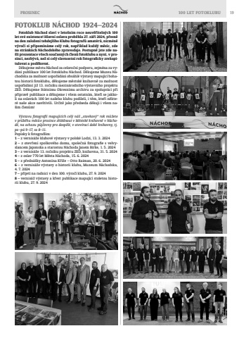 PROSINEC 100 LET FOTOKLUBU 19FOTOKLUB N%u00c1CHOD 1924%u20132024Fotoklub N%u00e1chod slav%u00ed v leto%u0161n%u00edm roce neuv%u011b%u0159iteln%u00fdch 100 let sv%u00e9 existence! Hlavn%u00ed oslava prob%u011bhla 27. z%u00e1%u0159%u00ed 2024, p%u0159esn%u011b na den zalo%u017een%u00ed tehdej%u0161%u00edho Klubu fotograf%u016f amat%u00e9r%u016f, nicm%u00e9n%u011b v%u00fdro%u010d%u00ed si p%u0159ipom%u00edn%u00e1me cel%u00fd rok, nap%u0159%u00edklad ka%u017ed%u00fd m%u011bs%u00edc, zde na str%u00e1nk%u00e1ch N%u00e1chodsk%u00e9ho zpravodaje. Postupn%u011b jste zde na%u0161li prezentace v%u0161ech sou%u010dasn%u00fdch %u010dlen%u016f fotoklubu a nyn%u00ed, v prosinci, nezb%u00fdv%u00e1, ne%u017e si cel%u00fd slavnostn%u00ed rok fotograficky zrekapitulovat a pod%u011bkovat.D%u011bkujeme m%u011bstu N%u00e1chod za celoro%u010dn%u00ed podporu, zejm%u00e9na za vyd%u00e1n%u00ed publikace 100 let Fotoklubu N%u00e1chod. D%u011bkujeme Muzeu N%u00e1chodska za mo%u017enost uspo%u0159%u00e1d%u00e1n%u00ed obs%u00e1hl%u00e9 v%u00fdstavy mapuj%u00edc%u00ed bohatou historii fotoklubu, d%u011bkujeme m%u011bstsk%u00e9 knihovn%u011b za mo%u017enost uspo%u0159%u00e1d%u00e1n%u00ed ji%u017e 13. ro%u010dn%u00edku mezin%u00e1rodn%u00edho v%u00fdstavn%u00edho projektu ZE%u010e. D%u011bkujeme St%u00e1tn%u00edmu Okresn%u00edmu archivu za spolupr%u00e1ci p%u0159i p%u0159%u00edprav%u011b publikace a d%u011bkujeme i v%u0161em ostatn%u00edm, kte%u0159%u00ed se jakkoli na oslav%u00e1ch 100 let na%u0161eho klubu pod%u00edleli, i t%u011bm, kte%u0159%u00ed n%u011bkter%u00e9 na%u0161e akce nav%u0161t%u00edvili. Ur%u010dit%u011b jako p%u0159edseda d%u011bkuji i v%u0161em na%u0161im %u010dlen%u016fm!V%u00fdstavu fotografi%u00ed mapuj%u00edc%u00edch cel%u00fd n%u00e1%u0161 %u201estovkov%u00fd%u201c rok m%u016f%u017eete v pr%u016fb%u011bhu m%u011bs%u00edce prosince zhl%u00e9dnout v M%u011bstsk%u00e9 knihovn%u011b v N%u00e1chod%u011b, na ochozu p%u016fj%u010dovny pro dosp%u011bl%u00e9, v otev%u00edrac%u00ed dob%u011b knihovny, tj. po%u2013p%u00e1 9%u201317, so 8%u201311.Popisky k fotografi%u00edm: 1 %u2013 z vernis%u00e1%u017ee klubov%u00e9 v%u00fdstavy v polsk%u00e9 Lodzi, 13. 3. 2024 2 %u2013 z otev%u0159en%u00ed spolkov%u00e9ho domu, spole%u010dn%u00e1 fotografie s velvyslancem Japonska a starostou N%u00e1choda Janem Birke, 1. 5. 20243 %u2013 z vernis%u00e1%u017ee 13. ro%u010dn%u00edku projektu ZE%u010e, knihovna, 31. 5. 20244 %u2013 z oslav 770 let M%u011bsta N%u00e1choda, 15. 6. 2024 5 %u2013 z p%u0159edn%u00e1%u0161ky Anton%u00edna K%u0159%u00ed%u017ee %u2013 Otto Raiman, 20. 6. 2024 6 %u2013 z vernis%u00e1%u017ee v%u00fdstavy o historii klubu, Muzeum N%u00e1chodska, 4. 7. 2024 7 %u2013 p%u0159ijet%u00ed na radnici v den 100. v%u00fdro%u010d%u00ed klubu, 27. 9. 2024 8 %u2013 vernis%u00e1%u017e v%u00fdstavy a k%u0159est publikace mapuj%u00edc%u00ed stoletou historii klubu, 27. 9. 2024