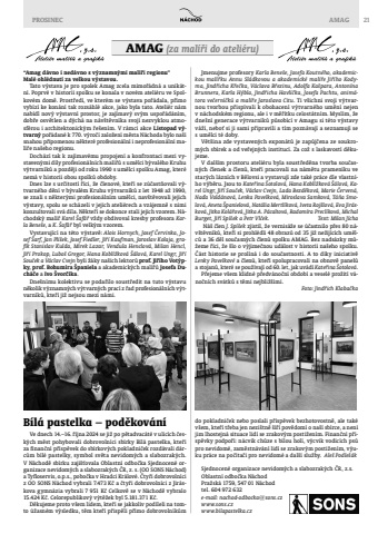 PROSINEC AMAG 21AMAG (za mal%u00ed%u0159i do ateli%u00e9ru)%u201cAmag d%u00e1vno i ned%u00e1vno s v%u00fdznamn%u00fdmi mal%u00ed%u0159i regionu%u201dMal%u00e9 ohl%u00e9dnut%u00ed za velkou v%u00fdstavou.Tato v%u00fdstava je pro spolek Amag zcela mimo%u0159%u00e1dn%u00e1 a unik%u00e1tn%u00ed. Poprv%u00e9 v historii spolku se konala v nov%u00e9m ateli%u00e9ru ve Spolkov%u00e9m dom%u011b. Prost%u0159ed%u00ed, ve kter%u00e9m se v%u00fdstava po%u0159%u00e1dala, p%u0159%u00edmo vyb%u00edz%u00ed ke kon%u00e1n%u00ed tak rozs%u00e1hl%u00e9 akce, jako byla tato. Ateli%u00e9r n%u00e1m nab%u00eddl nov%u00fd v%u00fdstavn%u00ed prostor, je zaj%u00edmav%u00fd sv%u00fdm uspo%u0159%u00e1d%u00e1n%u00edm, dob%u0159e osv%u011btlen a d%u00fdch%u00e1 na n%u00e1v%u0161t%u011bvn%u00edka svoj%u00ed nezvyklou atmosf%u00e9rou i architektonick%u00fdm %u0159e%u0161en%u00edm. V r%u00e1mci akce Listopad v%u00fdtvarn%u00fd po%u0159%u00e1dan%u00e9 k 770. v%u00fdro%u010d%u00ed zalo%u017een%u00ed m%u011bsta N%u00e1choda bylo na%u0161%u00ed snahou p%u0159ipomenou n%u011bkter%u00e9 profesion%u00e1ln%u00ed i neprofesion%u00e1ln%u00ed mal%u00ed%u0159e na%u0161eho regionu.Doch%u00e1z%u00ed tak k zaj%u00edmav%u00e9mu propojen%u00ed a konfrontaci mezi vystaven%u00fdmi d%u00edly profesion%u00e1ln%u00edch mal%u00ed%u0159%u016f s um%u011blci b%u00fdval%u00e9ho Kruhu v%u00fdtvarn%u00edk%u016f a pozd%u011bji od roku 1990 s um%u011blci spolku Amag, kter%u00e9 nem%u00e1 v historii obou spolk%u016f obdoby.Dnes lze s ur%u010ditost%u00ed %u0159%u00edci, %u017ee %u010dlenov%u00e9, kte%u0159%u00ed se z%u00fa%u010dast%u0148ovali v%u00fdtvarn%u00e9ho d%u011bn%u00ed v b%u00fdval%u00e9m Kruhu v%u00fdtvarn%u00edk%u016f z let 1948 a%u017e 1990, se znali s n%u011bkter%u00fdmi profesion%u00e1ln%u00edm um%u011blci, nav%u0161t%u011bvovali jejich v%u00fdstavy, spolu se sch%u00e1zeli v jejich ateli%u00e9rech a vz%u00e1jemn%u011b s nimi konzultovali sv%u00e1 d%u00edla. N%u011bkte%u0159%u00ed se dokonce stali jejich vzorem. N%u00e1chodsk%u00fd mal%u00ed%u0159 Karel %u0160af%u00e1%u0159 v%u017edy obdivoval kresby profesora Karla Bene%u0161e, a K. %u0160af%u00e1%u0159 byl velk%u00fdm vzorem.Vystavuj%u00edc%u00ed na t%u00e9to v%u00fdstav%u011b: Alois Hornych, Josef %u010cervinka, Josef %u0160arf, Jan Pl%u00ed%u0161ek, Josef Fiedler, Ji%u0159%u00ed Kaufman, Jaroslav Kolaja, grafik Stanislav Kulda, Mirek Lazar, Vendula Henclov%u00e1, Milan Hencl, Ji%u0159%u00ed Prokop, Lubo%u0161 Gregor, Hana Kobl%u00ed%u017ekov%u00e1 %u0160%u00e1lov%u00e1, Karel Ungr, Ji%u0159%u00ed Sou%u010dek a V%u00e1clav Cvejn byli %u017e%u00e1ky na%u0161ich lektor%u016f prof. Ji%u0159%u00edho Vot%u00fdpky, prof. Bohum%u00edra %u0160paniela a akademick%u00fdch mal%u00ed%u0159%u016f Josefa Duch%u00e1%u010de a Ivo %u0160vor%u010d%u00edka.Dne%u0161n%u00edmu kolektivu se poda%u0159ilo soust%u0159edit na tuto v%u00fdstavu n%u011bkolik v%u00fdznamn%u00fdch v%u00fdtvarn%u00fdch prac%u00ed z %u0159ad profesion%u00e1ln%u00edch v%u00fdtvarn%u00edk%u016f, kte%u0159%u00ed ji%u017e nejsou mezi n%u00e1mi.Jmenujme profesory Karla Bene%u0161e, Josefa Koutn%u00e9ho, akademickou mal%u00ed%u0159ku Annu Sl%u00e1dkovou a akademick%u00e9 mal%u00ed%u0159e Ji%u0159%u00edho Kodyma, Jind%u0159icha K%u0159e%u010dka, V%u00e1clava B%u0159ezinu, Adolfa Ka%u0161para, Anton%u00edna Brunnera, Karla H%u00fdbla, Jind%u0159icha Havl%u00ed%u010dka, Josefa Pachtu, anim%u00e1tora ve%u010dern%u00ed%u010dk%u016f a mal%u00ed%u0159e Jaroslava Citu. Ti v%u0161ichni svoji v%u00fdtvarnou tvorbou p%u0159isp%u00edvali k obohacen%u00ed v%u00fdtvarn%u00e9ho um%u011bn%u00ed nejen v n%u00e1chodsk%u00e9m regionu, ale i v m%u011b%u0159%u00edtku celost%u00e1tn%u00edm. Mysl%u00edm, %u017ee dne%u0161n%u00ed generace v%u00fdtvarn%u00edk%u016f p%u016fsob%u00edc%u00ed v Amagu si t%u00e9to v%u00fdstavy v%u00e1%u017e%u00ed, nebo%u0165 si ji sami p%u0159ipravili a t%u00edm pozn%u00e1vaj%u00ed a seznamuj%u00ed se s um%u011blci t%u00e9 doby. V%u011bt%u0161ina zde vystaven%u00fdch expon%u00e1t%u016f je zap%u016fj%u010dena ze soukrom%u00fdch sb%u00edrek a od ve%u0159ejn%u00fdch instituc%u00ed. Za co%u017e s laskavost%u00ed d%u011bkujeme.V dal%u0161%u00edm prostoru ateli%u00e9ru byla soust%u0159ed%u011bna tvorba sou%u010dasn%u00fdch %u010dlenek a %u010dlen%u016f, kte%u0159%u00ed pracovali na n%u00e1m%u011btu pramen%u00edku ve star%u00fdch l%u00e1zn%u00edch v B%u011blovsi a vystavuj%u00ed zde tak%u00e9 pr%u00e1ce dle vlastn%u00edho v%u00fdb%u011bru. Jsou to Kate%u0159ina %u0160otolov%u00e1, Hana Kobl%u00ed%u017ekov%u00e1 %u0160%u00e1lov%u00e1, Karel Ungr, Ji%u0159%u00ed Sou%u010dek, V%u00e1clav Cvejn, Lada Bezd%u011bkov%u00e1, Marie %u010cerven%u00e1, Na%u010fa Vold%u00e1nov%u00e1, Lenka Pavelkov%u00e1, Miroslava Samkov%u00e1, T%u00e1%u0148a Smolov%u00e1, Aneta %u0160panielov%u00e1, Nat%u00e1lia Mertl%u00edkov%u00e1, Iveta Roj%u0161lov%u00e1, Eva Jir%u00e1skov%u00e1, Jitka Kol%u00e1%u0159ov%u00e1, Jitka A. P%u00e1caltov%u00e1, Radom%u00edra Precl%u00edkov%u00e1, Michal Burget, Ji%u0159%u00ed Sp%u00ed%u0161ek a Petr Vl%u010dek. Text: Milan J%u00edcha N%u00e1%u0161 %u010dlen J. Sp%u00ed%u0161ek zjistil, %u017ee vernis%u00e1%u017ee se %u00fa%u010dastnilo p%u0159es 80 n%u00e1v%u0161t%u011bvn%u00edk%u016f, kte%u0159%u00ed si prohl%u00e9dli 48 obraz%u016f od 35 ji%u017e ne%u017eij%u00edc%u00edch um%u011blc%u016f a 36 d%u011bl sou%u010dasn%u00fdch %u010dlen%u016f spolku AMAG. Bez nads%u00e1zky m%u016f%u017eeme %u0159%u00edci, %u017ee %u0161lo o v%u00fdjime%u010dnou ud%u00e1lost v historii na%u0161eho spolku. %u010c%u00e1st historie se prol%u00edn%u00e1 i do sou%u010dastnosti. A to d%u00edky iniciativ%u011b Lenky Pavelkov%u00e9 a %u010dlen%u016f, kte%u0159%u00ed spolupracovali na obnov%u011b panel%u016f a stojan%u016f, kter%u00e9 se pou%u017e%u00edvaj%u00ed od 60. let, jak uv%u00e1d%u00ed Kate%u0159ina %u0160otolov%u00e1. P%u0159ejeme v%u0161em klidn%u00e9 p%u0159edv%u00e1no%u010dn%u00ed obdob%u00ed a vesel%u00e9 pro%u017eit%u00ed v%u00e1no%u010dn%u00edch sv%u00e