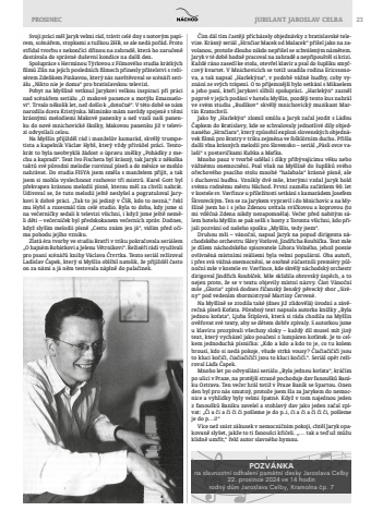PROSINEC JUBILANT JAROSLAV CELBA 23Svoji pr%u00e1ci m%u011bl Jaryk velmi r%u00e1d, tr%u00e1vit cel%u00e9 dny s notov%u00fdm pap%u00edrem, sc%u00e9n%u00e1%u0159em, stopkami a tu%u017ekou 2HB, se ale ned%u00e1 po%u0159%u00e1d. Proto st%u0159%u00eddal tvorbu s nekon%u010d%u00edc%u00ed d%u0159inou na zahrad%u011b, kter%u00e1 ho zaru%u010den%u011b dost%u00e1vala do spr%u00e1vn%u00e9 du%u0161evn%u00ed kondice na dal%u0161%u00ed den.Spolupr%u00e1ce s Herm%u00ednou T%u00fdrlovou z Filmov%u00e9ho studia kr%u00e1tk%u00fdch fi lm%u016f Zl%u00edn na jejich posledn%u00edch fi lmech p%u0159inesly p%u0159%u00e1telstv%u00ed s re%u017eis%u00e9rem Zde%u0148kem Pinkavou, kter%u00fd n%u00e1s nav%u0161t%u011bvoval se sc%u00e9n%u00e1%u0159i seri%u00e1lu %u201eNikto nie je doma%u201c pro bratislavskou televizi.Pobyt na My%u0161l%u00edn%u011b vetknul Jarykovi velkou inspiraci p%u0159i pr%u00e1ci nad sc%u00e9n%u00e1%u0159em seri%u00e1lu %u201eO makov%u00e9 panence a mot%u00fdlu Emanuelovi%u201c. Trvalo n%u011bkolik let, ne%u017e do%u0161lo k %u201edoto%u010dn%u00e9%u201c. V t%u00e9to dob%u011b se n%u00e1m narodila dcera Krist%u00fdnka. Miminko m%u00e1m nav%u017edy spojen%u00e9 s t%u011bmi kr%u00e1sn%u00fdmi melodiemi Makov%u00e9 panenky a ne%u017e vzali na%u0161i panenku do nov%u00e9 mnichovick%u00e9 %u0161kolky, Makovou panenku ji%u017e v televizi odvys%u00edlali celou.Na My%u0161l%u00edn p%u0159ij%u00ed%u017ed%u011bl r%u00e1d i man%u017eel%u016fv kamar%u00e1d, skv%u011bl%u00fd trumpetista a kapeln%u00edk V%u00e1clav Hyb%u0161, kter%u00fd v%u017edy p%u0159iv%u00e1%u017eel pr%u00e1ci. Tentokr%u00e1t to byla neobvykl%u00e1 %u017e%u00e1dost o %u00fapravu zn%u011blky %u201ePoh%u00e1dky z mechu a kaprad%u00ed%u201c. Text Ivo Fischera byl kr%u00e1sn%u00fd, tak Jaryk z n%u011bkolka takt%u016f sv%u00e9 p%u016fvodn%u00ed melodie rozvinul p%u00edse%u0148 a do m%u011bs%u00edce se mohlo nahr%u00e1vat. Do studia FISYA jsem sm%u011bla s man%u017eelem p%u0159ij%u00edt, a tak jsem si mohla vyslechnout rozhovor t%u0159%u00ed mistr%u016f. Karel Gott byl p%u0159ekvapen kr%u00e1snou melodi%u00ed p%u00edsn%u011b, kterou m%u011bl za chv%u00edli nahr%u00e1t. Udivoval se, %u017ee tuto melodii je%u0161t%u011b nesly%u0161el a pogratuloval Jarykovi k dobr%u00e9 pr%u00e1ci. %u201eTak to jsi jedin%u00fd v %u010cSR, kdo to nezn%u00e1,%u201c %u0159ekl mu Hyb%u0161 a rozesm%u00e1l t%u00edm cel%u00e9 studio. Byla to doba, kdy jsme si na ve%u010dern%u00ed%u010dky sedali k televizi v%u0161ichni, i kdy%u017e jsme je%u0161t%u011b nem%u011bli d%u011bti %u2013 ve%u010dern%u00ed%u010dek byl p%u0159edskokanem ve%u010dern%u00edch zpr%u00e1v. Dodnes, kdy%u017e sly%u0161%u00edm melodii p%u00edsn%u011b %u201eCestu zn%u00e1m jen j%u00e1%u201c, vid%u00edm p%u0159ed o%u010dima pohodu jej%u00edho vzniku.Zlat%u00e1 %u00e9ra tvorby ve studiu Brat%u0159i v triku pokra%u010dovala seri%u00e1lem %u201eO hajn%u00e9m Rob%u00e1tkovi a Jelenu V%u011btrn%u00edkovi%u201c. Re%u017eis%u00e9%u0159i r%u00e1di vyu%u017e%u00edvali pro psan%u00ed sc%u00e9n%u00e1%u0159%u016f knihy V%u00e1clava %u010ctvrtka. Tento seri%u00e1l re%u017e%u00edroval Ladislav %u010capek, kter%u00fd si My%u0161l%u00edn obl%u00edbil natolik, %u017ee p%u0159ij%u00ed%u017ed%u011bl %u010dasto on za n%u00e1mi a j%u00e1 n%u011bm testovala n%u00e1pln%u011b do pala%u010dinek.%u010c%u00edm d%u00e1l t%u00edm %u010dast%u011bji p%u0159ich%u00e1zely objedn%u00e1vky z bratislavsk%u00e9 televize. Kr%u00e1sn%u00fd seri%u00e1l %u201eHrn%u010diar Macek od Malacek%u201c p%u0159i%u0161el jako na zavolanou, proto%u017ee dlouho nikdo nep%u0159i%u0161el se schv%u00e1len%u00fdm n%u00e1m%u011btem. Jaryk v t%u00e9 dob%u011b hodn%u011b pracoval na zahrad%u011b a nep%u0159ipou%u0161t%u011bl si krizi. Ka%u017ed%u00e9 r%u00e1no zasedl ke stolu, otev%u0159el klav%u00edr a psal do %u0161upl%u00edku smy%u010dcov%u00fd kvartet. V Mnichovic%u00edch se toti%u017e usadila rodina Ericssonova, a tak napsal %u201eHarlek%u00fdna%u201c, v podob%u011b v%u00e1%u017en%u00e9 hudby, coby vyzn%u00e1n%u00ed ze sv%u00fdch tr%u00e1pen%u00ed. O to p%u0159%u00edjemn%u011bj%u0161%u00ed bylo setk%u00e1n%u00ed s Mikaelem a jeho pan%u00ed, kte%u0159%u00ed Jarykovi sl%u00edbili spolupr%u00e1ci. %u201eHarlek%u00fdn%u201c zazn%u011bl poprv%u00e9 v jejich pod%u00e1n%u00ed v hotelu My%u0161l%u00edn, pozd%u011bji tento kus nahr%u00e1l ve sv%u00e9m studiu %u201eBud%u00edkov%u201c skv%u011bl%u00fd mnichovick%u00fd muzikant Martin Kratochv%u00edl.Jako by %u201eHarlek%u00fdn%u201c zlomil sm%u016flu a Jaryk za%u010dal jezdit s L%u00e1%u010fou %u010capkem do Bratislavy, kde se schvalovaly jednotliv%u00e9 d%u00edly objednan%u00e9ho %u201eHrn%u010diara%u201c, kter%u00fd zp%u016fsobil explozi slovensk%u00fdch objedn%u00e1vek fi lm%u016f pro Bratry v triku zejm%u00e9na ve folkl%u00f3rn%u00edm duchu. P%u0159i%u0161la dal%u0161%u00ed vlna kr%u00e1sn%u00fdch melodi%u00ed pro Slovensko %u2013 seri%u00e1l %u201eP%u00e1sli ovce vala%u0161i%u201c s postavi%u010dkami Kubka a Ma%u0165ka.Mnoho pauz v tvorb%u011b ud%u011blal i d%u00edky p%u0159ib%u00fdvaj%u00edc%u00edmu v%u011bku nebo v%u00e1%u017en%u00e9mu onemocn%u011bn%u00ed. Psal v%u0161ak na My%u0161l%u00edn%u011b do %u0161upl%u00edk%u016f sv%u00e9ho o%u0159echov%u00e9ho psac%u00edho stolu mnoh%u00e9 %u201chalabala%u201c kr%u00e1sn%u00e9 p%u00edsn%u011b, ale i duchovn%u00ed hudbu. Vznikly dv%u011b m%u0161e, kter%u00fdmi vzdal Jaryk hold sv%u00e9mu rodn%u00e9mu m%u011bstu N%u00e1chod. Prvn%u00ed zazn%u011bla za%u010d%u00e1tkem 90. let v kostele sv. Vav%u0159ince u p%u0159%u00edle%u017eitosti setk%u00e1n%u00ed s kamar%u00e1dem Josefem %u0160kvoreck%u00fdm. Ten se za Jarykem vypravil i do Mnichovic a na My%u0161l%u00edn%u011b jsem ho i s jeho Zdenou uv%u00edtala sv%u00ed%u010dkovou a koprovou (to mi vd%u011b%u010dn%u00e1 Zdena nikdy nezapomn%u011bla). Ve%u010der p%u0159ed nabit%u00fdm s%u00e1lem hotelu My%u0161l%u00edn se pak se%u0161li s hosty z Toronta v%u0161ichni, kdo p%u0159ijali pozv%u00e1n%u00ed od na%u0161eho spolku %u201eMy
