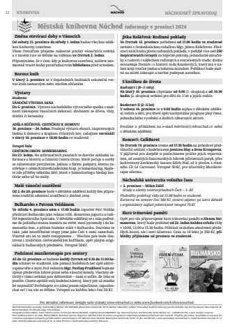 32 KNIHOVNA N%u00c1CHODSK%u00dd ZPRAVODAJPro aktu%u00e1ln%u00ed informace sledujte na%u0161e str%u00e1nky www.mknachod.cz nebo www.facebook.com/knihovnanachod.M%u011bstsk%u00e1 knihovna N%u00e1chod informuje v prosinci 2024M%u011bs%u00ed%u010dn%u00edk N%u00e1chodsk%u00fd zpravodaj. Vyd%u00e1v%u00e1 M%u011bsto N%u00e1chod, I%u010cO: 00272868, Masarykovo n%u00e1m%u011bst%u00ed 40, 547 01 N%u00e1chod. Odpov%u011bdn%u00fd redaktor: Nina Adlof. Redak%u010dn%u00ed rada: Ing. Jaroslav Rohul%u00e1n, Ing. Eva %u010cejchanov%u00e1, Hana Kopeck%u00e1, Bc. Martin Hurd%u00e1lek, Petr B%u0159enda a Mgr. V%u011bra Vl%u010dkov%u00e1. Fotografie po%u0159%u00eddila redakce, auto%u0159i %u010dl%u00e1nk%u016f a archiv. Tituln%u00ed foto: Martin Hurd%u00e1lek. Grafick%u00e1 %u00faprava CREOPRESS, Ing. Vlastimil %u010cejchan, Hru%u0161kov%u00e1 204, 547 01 N%u00e1chod, tel.: +420 603 311 052, e-mail: studio@creopress. %u010c%u00edslo 12/2024 vych%u00e1z%u00ed 2. 12. 2024. N%u00e1klad 5000 ks. Distribuce zdarma. Registrace: MK %u010cR E 11975. Za zm%u011bny v programech zodpov%u00eddaj%u00ed po%u0159adatel%u00e9 jednotliv%u00fdch akc%u00ed a po%u0159ad%u016f. P%u0159%u00edsp%u011bvky jsou v%u00edt%u00e1ny, nevy%u017e%u00e1dan%u00e9 se nevracej%u00ed. Neozna%u010den%u00e9 a nepodepsan%u00e9 p%u0159%u00edsp%u011bvky po%u0159%u00eddila redakce. Adresa %u010dasopisu: NZ, M%u011bstsk%u00fd %u00fa%u0159ad v N%u00e1chod%u011b, Masarykovo n%u00e1m%u011bst%u00ed 40, 547 01, tel./fax: 491 405 255, e-mail: zpravodaj@mestonachod.cz. Uz%u00e1v%u011brka tohoto %u010d%u00edsla byla 15. 11. 2024. Uz%u00e1v%u011brka lednov%u00e9ho %u010d%u00edsla bude ji%u017e 10. 12. 2024. Pros%u00edme o respektov%u00e1n%u00ed data uz%u00e1v%u011brky. D%u011bkujeme.Zm%u011bna otev%u00edrac%u00ed doby o V%u00e1noc%u00edchOd soboty 21. prosince do st%u0159edy 1. ledna budou v%u0161echna odd%u011blen%u00ed knihovny uzav%u0159ena.V%u0161em %u010dten%u00e1%u0159%u016fm p%u0159ejeme radostn%u00e9 pro%u017eit%u00ed v%u00e1no%u010dn%u00edch sv%u00e1tk%u016f a v nov%u00e9m roce se t%u011b%u0161%u00edme na vid%u011bnou ve %u010dtvrtek 2. ledna.P%u0159ipom%u00edn%u00e1me, %u017ee v %u010dase, kdy je knihovna uzav%u0159en%u00e1, m%u016f%u017eete neomezen%u011b vracet knihy prost%u0159ednictv%u00edm biblioboxu p%u0159ed vchodem.Rozvoz knihV %u00fater%u00fd 3. prosince se v dopoledn%u00edch hodin%u00e1ch uskute%u010dn%u00ed rozvoz knih nemocn%u00fdm nebo star%u0161%u00edm ob%u010dan%u016fm.V%u00fdstavyStudovnaV%u00c1NO%u010cN%u00cd V%u00ddSTAVA SANADo 6. prosince. V%u00fdstava n%u00e1chodsk%u00e9ho v%u00fdtvarn%u00e9ho spolku s mo%u017enost%u00ed zakoupen%u00ed v%u00e1no%u010dn%u00edch dekorac%u00ed, drobnost%u00ed ze d%u0159eva, vlny, dr%u00e1tk%u016f %u010di keramiky. AD%u00c9LA R%u00da%u010cKOV%u00c1: CESTI%u010cKOU K DOMOVU10. prosince %u2013 24. ledna. Prodejn%u00ed v%u00fdstavu obraz%u016f, inspirovan%u00fdch l%u00e1skou k domovu a krajinou Orlick%u00fdch hor, zah%u00e1j%u00edme vernis%u00e1%u017e%u00ed v %u00fater%u00fd 10. prosince v 18.00 hodin ve studovn%u011b. Vstupn%u00ed halaCENTRUM ORION: HOMESHARINGDo 23. ledna. Na informa%u010dn%u00edch panelech se dozv%u00edte z%u00e1kladn%u00ed informace o historii a %u010dinnosti Centra Orion, kter%u00e9 pe%u010duje o osoby se zdravotn%u00edm posti%u017een%u00edm. Jednou z forem podpory, kterou zast%u0159e%u0161uje v cel%u00e9m Kr%u00e1lov%u00e9hradeck%u00e9m kraji, je homesharing. Najdete zde p%u0159%u00edb%u011bhy n%u011bkolika d%u011bt%u00ed, kter%u00e9 v homesharingu hledaj%u00ed hostitele nebo u%u017e ho na%u0161ly. Mal%u00e9 v%u00e1no%u010dn%u00ed sout%u011b%u017een%u00edOd 2. do 20. prosince bude v d%u011btsk%u00e9m odd%u011blen%u00ed ka%u017ed%u00fd den p%u0159ipraveno tradi%u010dn%u00ed adventn%u00ed sout%u011b%u017een%u00ed o drobn%u00e9 ceny. Bulharsko s Petrem Vold%u00e1nemVe st%u0159edu 4. prosince n%u00e1m v 17.00 hodin report%u00e9r Petr Vold%u00e1n p%u0159edstav%u00ed Bulharsko jako velmoc r%u016f%u017e%u00ed, domovinu jogurtu a rodi%u0161t%u011b legend%u00e1rn%u00edho Spartaka. V d%u011btsk%u00e9m odd%u011blen%u00ed se s n%u00edm pod%u00edv%u00e1me do jedin%u00e9ho muzea humoru na sv%u011bt%u011b, mezi pyramidy i do kamenn%u00e9ho lesa, a p%u0159itom budeme st%u00e1le v Bulharsku. Dozv%u00edme se tak%u00e9, jak%u00e9 neuv%u011b%u0159iteln%u00e9 stopy jsme jako %u010ce%u0161i v zemi zanechali. Vlastn%u011b ani na to mo%u0159e nezapomene%u2026 V%u0161echno pak bude ilustrovat i tradi%u010dn%u00edm cestovatelsk%u00fdm kuf%u0159%u00edkem, op%u011bt pln%u00fdm origin%u00e1ln%u00edch bulharsk%u00fdch p%u0159edm%u011bt%u016f. Vstupn%u00e9 50K%u010d.Podzimn%u00ed muzikoterapie pro senioryA%u017e do 12. prosince se budeme ka%u017ed%u00fd %u010dtvrtek od 9.30 do 11.00 hodin sch%u00e1zet ve studovn%u011b, kde pomoc%u00ed hudebn%u00edch her op%u011bt aktivizujeme t%u011blo a mysl. Pod veden%u00edm Mgr. Pavl%u00edny Prudilov%u00e9 budeme zp%u00edvat p%u0159edev%u0161%u00edm lidov%u00e9 p%u00edsn%u011b nebo v%u00e1no%u010dn%u00ed koledy. V%u0161echny aktivity v r%u00e1mci setk%u00e1n%u00ed jsou dobrovoln%u00e9 %u2013 sami si ur%u010d%u00edte, do %u010deho se pust%u00edte. Chcete opr%u00e1%u0161it sv%u016fj hudebn%u00ed n%u00e1stroj, kter%u00fd jste u%u017e mnoho let nepou%u017eili? Pot%u0159ebujete si s n%u00e1mi jenom odpo%u010dinout, zaposlouchat se? I na v%u00e1s se t%u011b%u0161%u00edme. Vstupn%u00e9 na ka%u017edou lekci %u010din%u00ed 50 K%u010d.Jitka Kol%u00e1%u0159ov%u00e1: Rodinn%u00e9 pokladyVe %u010dtvrtek 12. prosince po%u0159%u00e1d%u00e1me od 17.00 hodin ve studovn%u011b setk%u00e1n%u00ed s %u010deskoskalickou roda%u010dkou Mgr. Jitkou Kol%u00e1%u0159ovou. P%u0159edstav%u00ed n%u00e1m knihu plnou rodinn%u00fdch poklad%u016f, v podob%u011b v%u00edce ne%u017e 250 inspirativn%u00edch recept%u016f na b%u00e1je%u010dn%u00e9 pokrmy, jednoduch%u00e9 mou%u010dn%u00edky a cukrov%u00ed s n%u00e1dechem rodinn%u00fdch a staro%u010desk%u00fdch tradic. Kniha seznamuje %u010dten%u00e1%u0159e i s histori