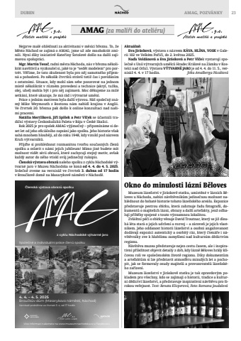 DUBEN AMAG, POZV%u00c1NKY 23AMAG (za mal%u00ed%u0159i do ateli%u00e9ru)Nejprve mal%u00e9 ohl%u00e9dnut%u00ed za aktivitami v m%u011bs%u00edci b%u0159eznu. To, %u017ee M%u011bsto N%u00e1chod se zaj%u00edm%u00e1 o AMAG, jsme u%u017e zde mnohokr%u00e1t zm%u00ednili. Nyn%u00ed d%u00edky iniciativ%u011b Kate%u0159iny %u0160otolov%u00e9 do%u0161lo na dal%u0161%u00ed zaj%u00edmavou spolupr%u00e1ci. Mgr. Martin Tesa%u0159, radn%u00ed m%u011bsta N%u00e1choda, n%u00e1s v b%u0159eznu n%u011bkolikr%u00e1t nav%u0161t%u00edvil a vyzkou%u0161el si, jak%u00e9 to je %u201csed%u011bt modelem%u201c pro portr%u00e9t. V%u011b%u0159%u00edme, %u017ee tato zku%u0161enost byla pro n%u011bj samotn%u00e9ho p%u0159%u00edjemn%u00e1 a pohodov%u00e1. Po n%u011bkolik %u010dtvrtk%u016f str%u00e1vil toti%u017e %u010das i pov%u00edd%u00e1n%u00edm s ostatn%u00edmi. Situace, kdy mohl s%u00e1m sebe pozorovat na jednom m%u00edst%u011b n%u011bkolikr%u00e1t v r%u016fzn%u00e9m proveden%u00ed a technice (akryl, tu%u017eka, olej, uhel) mohla b%u00fdt i pro n%u011bj zaj%u00edmav%u00e1. Moc d%u011bkujeme za mil%u00e9 setk%u00e1n%u00ed, kter%u00e9 ukazuje, %u017ee m%u00e1 r%u00e1d i v%u00fdtvarn%u00e9 um%u011bn%u00ed.Pr%u00e1ce s jedn%u00edm motivem byla dal%u0161%u00ed v%u00fdzvou. N%u00e1%u0161 spole%u010dn%u00fd zn%u00e1m%u00fd Mike Weymouth z Bostonu n%u00e1m nab%u00eddl krajinu v Anglii. Ve %u010dtvrtek 20. b%u0159ezna pak do%u0161lo k online konzultaci nad na%u0161imi pracemi. Nat%u00e1lia Mertl%u00edkov%u00e1, Ji%u0159%u00ed Sp%u00ed%u0161ek a Petr Vl%u010dek se %u00fa%u010dastnili tradi%u010dn%u00ed v%u00fdstavy %u010ceskoskalick%u00e1 Paleta v B%u00e1ju v %u010cesk%u00e9 Skalici.Rok 2025 je pro spolek AMAG v%u00fdjime%u010dn%u00fd %u2013 p%u0159ipom%u00edn%u00e1me si deset let od jeho ofici%u00e1ln%u00edho zaps%u00e1n%u00ed jako spolku. Jeho historie v%u0161ak sah%u00e1 mnohem hloub%u011bji, a%u017e do roku 1948, kdy vznikl pod n%u00e1zvem Kruh v%u00fdtvarn%u00edk%u016f.P%u0159ij%u010fte si prohl%u00e9dnout rozmanitou tvorbu sou%u010dasn%u00fdch %u010dlen%u016f spolku a oslavit s n%u00e1mi jejich jubileum! Mimo jin%u00e9 budete m%u00edt mo%u017enost vid%u011bt s%u00e9rii obraz%u016f, kter%u00e9 zachycuj%u00ed stejn%u00fd motiv, av%u0161ak ka%u017ed%u00fd autor do n%u011bho vtiskl sv%u016fj jedine%u010dn%u00fd rukopis.%u010clensk%u00e1 v%u00fdstava obraz%u016f na%u0161eho spolku z cyklu N%u00e1chodsk%u00e9 v%u00fdtvarn%u00e9 jaro v Muzeu N%u00e1chodska se kon%u00e1 od 4. 4. do 4. 5. 2025. Srde%u010dn%u011b zveme na vernis%u00e1%u017e ve %u010dtvrtek 3. dubna od 17 hodinv Brou%u010dkov%u011b dom%u011b na Masarykov%u011b n%u00e1m%u011bst%u00ed v N%u00e1chod%u011b. Aktu%u00e1ln%u011b: Eva Jir%u00e1skov%u00e1, v%u00fdstava s n%u00e1zvem K%u00c1VA, HL%u00cdNA, VOSK v Galerii 102 ve Velk%u00e9m Po%u0159%u00ed%u010d%u00ed, do 2. kv%u011btna 2025.Na%u010fa Vold%u00e1nov%u00e1 a Eva Jir%u00e1skov%u00e1 a Petr Vl%u010dek vystavuj%u00ed spole%u010dn%u011b s Uni%u00ed v%u00fdtvarn%u00fdch um%u011blc%u016f Hradec Kr%u00e1lov%u00e9 na Z%u00e1mku v Kostelci nad Orlic%u00ed. V%u00fdstava V%u00ddTVARN%u00c9 JARO je od 4. 4. do 11. 5., vernis%u00e1%u017e 4. 4. v 17 hodin. Jitka Amalberga P%u00e1caltov%u00e1V%u00edce informac%u00ed naleznete na www.muzeumnachodska.cz a Facebooku%u010clensk%u00e1 v%u00fdstava obraz%u016f spolkuz cyklu N%u00e1chodsk%u00e9 v%u00fdtvarn%u00e9 jaro4. 4. %u2013 4. 5. 2025Brou%u010dk%u016fv d%u016fm (Masarykovo n%u00e1m%u011bst%u00ed, N%u00e1chod)Vernis%u00e1%u017e prob%u011bhne ve %u010dtvrtek 3. 4. od 17 hodinSpole%u010dn%u00e9 a individu%u00e1ln%u00ed pr%u00e1ce %u010dlen%u016f spolkuMuzeum l%u00e1ze%u0148stv%u00ed v Jir%u00e1skov%u011b statku, um%u00edst%u011bn%u00e9 v l%u00e1zn%u00edch B%u011bloves u N%u00e1choda, nab%u00edz%u00ed n%u00e1v%u0161t%u011bvn%u00edk%u016fm jedine%u010dnou mo%u017enost nahl%u00e9dnout do bohat%u00e9 historie tohoto l%u00e1ze%u0148sk%u00e9ho are%u00e1lu. Expozice p%u0159edstavuje pestrou sb%u00edrku, kter%u00e1 zahrnuje %u0159adu fotografi%u00ed, dokument%u016f o majitel%u00edch l%u00e1zn%u00ed, obrazy a dal%u0161%u00ed artefakty, jen%u017e odhaluj%u00ed p%u0159%u00edb%u011bhy spojen%u00e9 s touto v%u00fdznamnou lokalitou.Zvl%u00e1%u0161tn%u00ed p%u00e9%u010di o sb%u00edrky v%u011bnuje David Troutnar, kter%u00fd se ji%u017e dlouh%u00e1 l%u00e9ta star%u00e1 o jejich udr%u017een%u00ed a rozvoj %u2013 a z%u00e1rove%u0148 je jejich vlastn%u00edkem. Jeho oddanost historii l%u00e1ze%u0148stv%u00ed a osobn%u00ed anga%u017eovanost dod%u00e1vaj%u00ed expozici autentick%u00fd a osobit%u00fd r%u00e1z, kter%u00fd %u010dten%u00e1%u0159e i n%u00e1v%u0161t%u011bvn%u00edky zve k hlub%u0161%u00edmu zamy%u0161len%u00ed nad kulturn%u00edm d%u011bdictv%u00edm regionu.N%u00e1v%u0161t%u011bva muzea p%u0159edstavuje nejen cestu %u010dasem, ale i inspirativn%u00ed p%u0159%u00edle%u017eitost objevit detaily z dob, kdy l%u00e1zn%u011b B%u011bloves hr%u00e1ly kl%u00ed%u010dovou roli ve spole%u010densk%u00e9m %u017eivot%u011b regionu. D%u00edky dokument%u016fm a artefakt%u016fm si lze p%u0159edstavit atmosf%u00e9ru minul%u00fdch let a pochopit, jak se formovaly osudy majitel%u016f a provozovatel%u016f l%u00e1ze%u0148sk%u00e9ho za%u0159%u00edzen%u00ed.Muzeum l%u00e1ze%u0148stv%u00ed v Jir%u00e1skov%u011b statku je tak opravdov%u00fdm pokladem pro v%u0161echny, kdo se zaj%u00edmaj%u00ed o historii, tradice a kulturn%u00ed d%u011bdictv%u00ed l%u00e1ze%u0148stv%u00ed, a p%u0159edstavuje inspirativn%u00ed n%u00e1v%u0161t%u011bvu pro %u0161irokou ve%u0159ejnost. Text: Renata Klicperov%u00e1, Foto: Romana Joudalov%u00e1Okno do minulosti l%u00e1zn%u00ed B%u011bloves