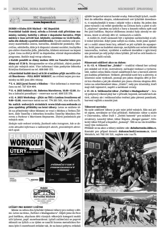 26 HOPS%u00c1%u010cEK, DUHA BARTO%u0147KA N%u00c1CHODSK%u00dd%u2009 ZPRAVODAJwww.hopsacek.czMC Hops%u00e1%u010dekDUBEN v Klubu SUN N%u00e1chod %u2013 MC Hops%u00e1%u010dekPravideln%u011b ka%u017ed%u00e9 %u00fater%u00fd, st%u0159edu a %u010dtvrtek r%u00e1di p%u0159iv%u00edt%u00e1me maminky, tat%u00ednky, babi%u010dky s d%u011btmi v dopoledn%u00ed herni%u010dce. P%u0159ij%u00edt m%u016f%u017eete v %u010dase od 9.00 hod, kdykoliv, zav%u00edr%u00e1me ve 12.00 hodin, nebo dle dohody a pot%u0159eb n%u00e1v%u0161t%u011bvn%u00edk%u016f. Vyu%u017e%u00edt m%u016f%u017eete cel%u00e9 prostory mate%u0159sk%u00e9ho centra, herni%u010dku, didaktick%u00e9 pom%u016fcky, t%u011blocvi%u010dnu, odr%u00e1%u017eedla, d%u00e1le je k dispozici z%u00e1zem%u00ed soci%u00e1ln%u00ed, kuchy%u0148ka pro oh%u0159ev vlastn%u00edho j%u00eddla, j%u00eddelni%u010dka, klidov%u00e1 m%u00edstnost na kojen%u00ed a jin%u00e9. Cena za d%u00edt%u011b je 60 K%u010d za dopoledne, v%u010detn%u011b doprovodn%u00e9ho programu. Rodi%u010de maj%u00ed vstup zdarma. Ka%u017ed%u00e9 pond%u011bl%u00ed se d%u00e1my mohou t%u011b%u0161it na Tane%u010dn%u00ed lekce pro d%u00e1my od 17.30 h. Nezapome%u0148te se v%u010das p%u0159ihl%u00e1sit, zb%u00fdv%u00e1 posledn%u00edch p%u00e1r voln%u00fdch m%u00edst. V%u00edce informac%u00ed v%u00e1m poskytne lektorka Krist%u00fdna Kotlanov%u00e1 na tel. 608 060 155. Pravideln%u011b ka%u017ed%u00e9 %u00fater%u00fd od 8.30 si m%u016f%u017eete p%u0159ij%u00edt zacvi%u010dit s Luci%u00ed %u0160kardovou %u2013 FULL BODY WOKOUT, na cvi%u010den%u00ed nejen pro maminky na MD jsou d%u011bti v%u00edt%u00e1ny.  5. 4. 2025 Jarn%u00ed focen%u00ed s Nikolou %u2013 V%u00edce informac%u00ed a rezervace %u010dasu na tel. 727 834 494. 11. 4. 2025 Setk%u00e1n%u00ed s Bc. Babetou Mare%u0161ovou, 10.00%u201312.00, dulou a lakta%u010dn%u00ed poradkyn%u00ed %u2013 rezervace na tel. 608 535 376. 12. 4. 2025 Workshop %u2013 J%u00d3GA na TRX s Lenkou Svozilovou od 9.00%u201312.00, rezervace nutn%u00e1 na tel. 774 201 501, v%u00edce info na fb.Na na%u0161ich webov%u00fdch str%u00e1nk%u00e1ch www.klub-sun.webnode.czjsou spu%u0161t%u011bny p%u0159ihl%u00e1%u0161ky na letn%u00ed t%u00e1bory. Letos se m%u016f%u017eete t%u011b%u0161it na p%u0159%u00edm%u011bstsk%u00fd t%u00e1bor Mimoni se vrac%u00ed s Mirkou a Terkou %u017di%u017ekovi, d%u00e1le Tane%u010dky s lektorkou krou%u017eku Tane%u010dky Monikou Petrovou a Parkour s Martinem Hepnarem. Zb%u00fdv%u00e1 posledn%u00edch p%u00e1r voln%u00fdch m%u00edst.Sledujte na%u0161e webov%u00e9 str%u00e1nky, facebook nebo instagram, kde se dozv%u00edte aktu%u00e1ln%u00ed informace o nab%u00edzen%u00fdch akc%u00edch, pravideln%u00fdch aktivit%u00e1ch apod.sj%u00ed%u017ed%u011bt bezpe%u010dn%u011b m%u00edstn%u00ed horsk%u00e9 svahy. Pokro%u010dilej%u0161%u00ed ly%u017ea%u0159i, rozd%u011blen%u00ed do n%u011bkolika skupin, zdokonalovali sv%u00e9 ly%u017ea%u0159sk%u00e9 dovednosti, ti nejzku%u0161en%u011bj%u0161%u00ed k tomu i n%u011bjak%u00e9 triky a skoky. Na jeden den jsme vyrazili i na velk%u00e9 sjezdovky na %u010cernou horu a pot%u00e9 si u%u017eili %u201ev%u00fdpravu%u201c sjezdem na ly%u017e%u00edch z hory a kousek rolbou zp%u011bt nad Pec pod Sn%u011b%u017ekou. Nejv%u00edce obl%u00edbenou atrakc%u00ed byly z%u00e1vody ve skikrosu, kter%u00e9 si u%u017e%u00edvaly d%u011bti v%u010d. vedouc%u00edch a rodi%u010d%u016f. A rodi%u010de (ti, kte%u0159%u00ed nemuseli b%u00fdt s %u00fapln%u00fdmi za%u010d%u00e1te%u010dn%u00edky) si u%u017eili voln%u00e9 ly%u017eov%u00e1n%u00ed. Kdy%u017e jsme nebyli na svahu, hr%u00e1li jsme spole%u010dn%u011b i s rodi%u010di zimn%u00ed lesn%u00ed hry, n%u011bkte%u0159%u00ed se jeli vy%u0159%u00e1dit do aquaparku, hr%u00e1li jsme na hudebn%u00ed n%u00e1stroje, nechyb%u011bla ani ve%u010dern%u00ed d%u011btsk%u00e1 tancova%u010dka, tvo%u0159en%u00ed, vyr%u00e1b%u011bn%u00ed a sn%u011bhov%u00e9 dov%u00e1d%u011bn%u00ed v igl%u00fa kter%u00fd n%u00e1s prov%u00e1zel po cel%u00fd pobyt obou ly%u017e%u00e1k%u016f. Ji%u017e te%u010f se cel%u00e1 banda rodin t%u011b%u0161%u00ed na dal%u0161%u00ed ro%u010dn%u00edk.Pl%u00e1novan%u00e9 odd%u00edlov%u00e9 akce na duben: 11.%u201313. 4. V%u00edkend her %u201eZr%u00e1dci%u201c %u2013 tradi%u010dn%u00ed v%u00edkend her ur%u010den%u00fd pro ml%u00e1de%u017e od 14 let, instruktory, za%u010d%u00ednaj%u00edc%u00ed vedouc%u00ed a vychovatel%u00e9, nab%u00edz%u00ed celou %u0161k%u00e1lu r%u016fzn%u011b zam%u011b%u0159en%u00fdch her a hern%u00edch aktivit pro ka%u017edou p%u0159%u00edle%u017eitost. Ve%u0161ker%u00e9, p%u0159ev%u00e1%u017en%u011b nov%u00e9 hry a aktivity, si %u00fa%u010dastn%u00edci sami vyzkou%u0161%u00ed, poznaj%u00ed pro jakou skupinu d%u011bt%u00ed je kter%u00e1 hra vhodn%u00e1 a jak jde obm%u011bnit pro jinou c%u00edlovou skupinu d%u011bt%u00ed. Letos na celov%u00edkendov%u00e9 t%u00e9ma %u201eZr%u00e1dci%u201c, tedy pro %u00fa%u010dastn%u00edky, kte%u0159%u00ed maj%u00ed r%u00e1di tajemstv%u00ed, nap%u011bt%u00ed a ne%u010dekan%u00e9 zvraty.  17.%u201319. 4. Velikono%u010dn%u00ed t%u00e1bor %u201eTu%u010d%u0148%u00e1ci s Madagaskaru%u201c %u2013 hrav%u00fd pobytov%u00fd v%u00edkend pln%u00fd her v p%u0159%u00edrod%u011b, bojovek, netradi%u010dn%u00edch aktivit, z%u00e1bavy ale i velikono%u010dn%u00edho tvo%u0159en%u00ed jako pleten%u00ed poml%u00e1zek, barven%u00ed vaj%u00ed%u010dek a mnoh%u00e9 jin%u00e9. T%u00e1borov%u00e9 novinky: Na na%u0161e odd%u00edlov%u00e9 t%u00e1bory je p%u00e1r m%u00edst je%u0161t%u011b voln%u00fdch. Kdo m%u00e1 je%u0161t%u011b z%u00e1jem, nev%u00e1hejte se v%u010das p%u0159ihl%u00e1sit. Nab%u00edz%u00edme: t%u00e1bor u mo%u0159e v Chorvatsku, t%u00e1bor Dul%u0161 1 %u201eDobit%u00ed baterek%u201c pro ml%u00e1de%u017e a instruktory, Lezeck%u00fd t%u00e1bor, t%u00e1bor %u0160l%u00e1pota %u201eHunger games%u201c, St%u0159eleck%u00fd t%u00e1bor Pif-paf a Expedici %u201eJumanji%u201c. T%u011b%u0161%u00ed se na v%u00e1s kvalifikovan%u00fd t%u00fdm vedouc%u00edch.P%u0159ihl%u00e1sit se na akce a 