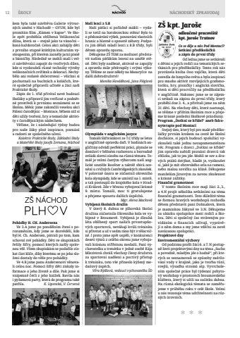 12 %u0160KOLY N%u00c1CHODSK%u00dd%u2009 ZPRAVODAJkem byla tak%u00e9 n%u00e1v%u0161t%u011bva Galerie v%u00fdtvarn%u00fdch um%u011bn%u00ed v N%u00e1chod%u011b %u2013 GVUN, kde byl prom%u00edt%u00e1n film %u201eK%u00e1men v kapse%u201c. Ve %u0161kole op%u011bt prob%u011bhla obl%u00edben%u00e1 Velikono%u010dn%u00ed d%u00edlna, kter%u00e1 se %u2013 stejn%u011b jako ta v%u00e1no%u010dn%u00ed %u2013 kon%u00e1 ka%u017edoro%u010dn%u011b. Celou akci zah%u00e1jily d%u011bti z prvn%u00edho stupn%u011b kr%u00e1tk%u00fdm kulturn%u00edm vystoupen%u00edm, p%u0159i kter%u00e9m zazn%u011bly jarn%u00ed p%u00edsn%u011b a b%u00e1sni%u010dky. N%u00e1sledn%u011b se mohli mal%u00ed i velc%u00ed n%u00e1v%u0161t%u011bvn%u00edci zapojit do tvo%u0159iv%u00fdch d%u00edlen, kde si vyzkou%u0161eli r%u016fzn%u00e9 techniky v%u00fdroby velikono%u010dn%u00edch zv%u00ed%u0159%u00e1tek a dekorac%u00ed. Nechyb%u011blo ani vo%u0148av%u00e9 ob%u010derstven%u00ed %u2013 v%u0161ichni si pochutnali na bucht%u00e1ch a kol%u00e1%u010d%u00edch, kter%u00e9 spole%u010dn%u011b p%u0159ipravili u%u010ditel%u00e9 a %u017e%u00e1ci na%u0161%u00ed Praktick%u00e9 %u0161koly.Z%u00e1pis do 1. t%u0159%u00edd p%u0159iv%u00edtal nov%u00e9 budouc%u00ed %u0161kol%u00e1ky a p%u0159ipravil jim vst%u0159%u00edcn%u00e9 a podn%u011btn%u00e9 prost%u0159ed%u00ed k prvn%u00edmu sezn%u00e1men%u00ed se se %u0161kolou. M%u011bs%u00edc jsme zakon%u010dili veselou akc%u00ed P%u00e1len%u00ed %u010darod%u011bjnic %u2013 Montace, b%u011bhem n%u00ed%u017e si d%u011bti u%u017eily tvo%u0159en%u00ed, hry a tematick%u00e9 aktivity s %u010darod%u011bjnick%u00fdm n%u00e1dechem.V%u011b%u0159%u00edme, %u017ee i n%u00e1sleduj%u00edc%u00ed t%u00fddny budou pro na%u0161e %u017e%u00e1ky pln%u00e9 inspirace, pozn%u00e1n%u00ed a radosti ze spole%u010dn%u00e9ho u%u010den%u00ed.Kolektiv Praktick%u00e9 %u0161koly, Z%u00e1kladn%u00ed %u0161koly a Mate%u0159sk%u00e9 %u0161koly Josefa Zemana, N%u00e1chodPoh%u00e1dky H. CH. AndersenaVe 3.A jsme po pond%u011bln%u00edm %u010dten%u00ed s porozum%u011bn%u00edm, kdy jsme se dozv%u011bd%u011bli, kdo byl H. Ch. Andersen, p%u00e1trali po tom, kam schoval sv%u00e9 poh%u00e1dky. D%u011bti ve skupink%u00e1ch %u0159e%u0161ily %u0161ifry, pomoc%u00ed kter%u00fdch na%u0161ly spr%u00e1vnou v%u011b%u017e. V%u0161em skupink%u00e1m se poda%u0159ilo z%u00edskat %u010d%u00e1st kl%u00ed%u010de, d%u00edky kter%u00e9mu se po jeho slo%u017een%u00ed dostaly do v%u011b%u017ee pro poh%u00e1dky.Ve 4.B jsme panu Andersenovi v%u011bnovali celou noc. Pomoc%u00ed %u0161ifry d%u011bti z%u00edskaly informace o jeho %u017eivot%u011b a d%u00edle. Pak jsme si vz%u00e1jemn%u011b %u010detli z jeho kn%u00ed%u017eek. Bavila n%u00e1s i py%u017eamov%u00e1 party, kter%u00e1 do programu tak%u00e9 pat%u0159ila. K. Lipensk%u00e1, V. %u010cerven%u00e1Mal%u00ed lezci z 5.BNa%u0161i p%u00e1%u0165%u00e1ci si po%u0159%u00e1dn%u011b m%u00e1kli %u2013 vydali se toti%u017e na horolezeckou st%u011bnu! Bylo to o p%u0159ekon%u00e1v%u00e1n%u00ed v%u00fd%u0161ek, posouv%u00e1n%u00ed vlastn%u00edch hranic a hlavn%u011b o spoust%u011b z%u00e1bavy. Podporu jim d%u011blali mlad%u00ed lezci z 8.B t%u0159%u00eddy, byli d%u011btem opravdu oporou.D%u011bkujeme Z%u0160 TGM za mo%u017enost p%u0159edstavit na%u0161im p%u00e1%u0165%u00e1k%u016fm lezen%u00ed na um%u011bl%u00e9 st%u011bn%u011b. D%u011bti byly nad%u0161en%u00e9, aktivn%u011b se zapojily a opravdu mile p%u0159ekvapily i sv%u00fdmi v%u00fdkony. T%u011b%u0161%u00edme se zase n%u011bkdy na Masary%u010dce na dal%u0161%u00ed dobrodru%u017estv%u00ed!Monika Hov%u00e1dkov%u00e1, Jana Fl%u00e9glov%u00e1Olympi%u00e1da v anglick%u00e9m jazyceTom%u00e1%u0161i Sk%u0159iv%u00e1nkovi ze 7.C t%u0159%u00eddy se letos v angli%u010dtin%u011b opravdu da%u0159%u00ed. V hodin%u00e1ch angli%u010dtiny odv%u00e1d%u00ed perfektn%u00ed pr%u00e1ci, plynule se domluv%u00ed v b%u011b%u017en%u00e9m rozhovoru a bezvadn%u011b ovl%u00e1d%u00e1 slovn%u00ed z%u00e1sobu na r%u016fzn%u00e1 t%u00e9mata. Tom%u00e1%u0161 je velmi %u010dast%u00fdm v%u00fdhercem na%u0161%u00ed anglick%u00e9 sout%u011b%u017ee BooSter a takt%u00e9%u017e sb%u00edr%u00e1 ocen%u011bn%u00ed u cvi%u010dn%u00fdch Cambridgesk%u00fdch zkou%u0161ek. V polovin%u011b %u00fanora se z%u00fa%u010dastnil okresn%u00edho kola olympi%u00e1dy, kde se um%u00edstil na 1. m%u00edst%u011b, a tak postoupil do krajsk%u00e9ho kola v Hradci Kr%u00e1lov%u00e9. Zde v b%u0159eznu vybojoval kr%u00e1sn%u00e9 9. m%u00edsto. Tom%u00e1%u0161i, moc ti gratulujeme a p%u0159ejeme spoustu dal%u0161%u00edch %u00fasp%u011bch%u016f. Mgr. Alena Mackov%u00e1Vyb%u00edjen%u00e1 %u0161koln%u00edch dru%u017einV %u00fater%u00fd 8. dubna se plhovsk%u00e1 %u0161koln%u00ed dru%u017eina z%u00fa%u010dastnila Okresn%u00edho kola ve vyb%u00edjen%u00e9 v Broumov%u011b. Vyb%u00edjen%u00e1 je dlouh%u00e1 l%u00e9ta obl%u00edben%u00fd sport na%u0161ich prvostup%u0148ov%u00fdch sportovc%u016f, nev%u00e1haj%u00ed kv%u016fli tr%u00e9ninku si p%u0159ivstat a u%u017e v sedm r%u00e1no b%u00fdt v t%u011blocvi%u010dn%u011b. I proto jsme op%u011bt usp%u011bli, v konkurenci deseti t%u00fdm%u016f z cel%u00e9ho okresu jsme vybojovali kr%u00e1snou st%u0159%u00edbrnou medaili. Pan%u00ed vychovatelka a tren%u00e9rka v jedn%u00e9 osob%u011b K%u00e1ja Mlezivov%u00e1 chv%u00e1l%u00ed v%u0161echny %u010dleny dru%u017estva za sportovn%u00ed nad%u0161en%u00ed a poctiv%u00fd p%u0159%u00edstup k tr%u00e9ninku, toto v%u0161e p%u0159ineslo k%u00fd%u017een%u00fd medailov%u00fd %u00fasp%u011bch.V%u011bra R%u00fddlov%u00e1, vedouc%u00ed vychovatelka %u0160D Co se d%u011bje u n%u00e1s Pod Montac%u00ed?Setk%u00e1n%u00ed p%u0159ed%u0161kol%u00e1%u010dk%u016f a z%u00e1pis do prvn%u00ed t%u0159%u00eddyOd ledna jsme se setk%u00e1vali s d%u011btmi a jejich rodi%u010di na tematick%u00fdch setk%u00e1n%u00edch pro p%u0159ed%u0161kol%u00e1%u010dky. Tento rok n%u00e1s prov%u00e1zela kniha Ooo vaj%u00ed%u010dko, kter%u00e1 d%u011bti zavedla do hmyz%u00edho sv%u011bta a byla inspirac%u00ed pro mnoho aktiv