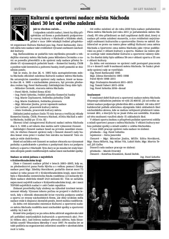 KV%u011aTEN 30 LET NADACE 23Jak to v%u0161echno za%u010dalo%u2026S n%u00e1padem zalo%u017eit nadaci, kter%u00e1 by d%u00edky p%u0159%u00edsp%u011bvk%u016fm od firem a podnikatel%u016f podporovala rozvoj kultury v N%u00e1chod%u011b a bl%u00edzk%u00e9m okol%u00ed, p%u0159i%u0161el v roce 1994 tehdej%u0161%u00ed %u0159editel p%u0159%u00edsp%u011bvkov%u00e9 organizace Kultura N%u00e1chod pan Ing. Pavel Rathousk%u00fd. Z%u00e1rove%u0148 m%u011bla tato nadace tak%u00e9 zviditelnit v%u00fdrazn%u00e9 osobnosti n%u00e1chodsk%u00e9 kultury.Ing. Rathousk%u00e9mu se poda%u0159ilo tuto my%u0161lenku prosadit u tehdej%u0161%u00edho starosty m%u011bsta N%u00e1choda pana Miloslava %u010cerm%u00e1ka a nav%u00edc se povedlo p%u0159esv%u011bd%u010dit a do spr%u00e1vn%u00ed rady nadace p%u0159iv%u00e9st %u0159editele t%u0159%u00ed v%u00fdznamn%u00fdch pobo%u010dek bank %u2013 Komer%u010dn%u00ed banky, %u010cSOB a posl%u00e9ze tak%u00e9 Investi%u010dn%u00ed a po%u0161tovn%u00ed banky, kte%u0159%u00ed pomohli se sh%u00e1n%u011bn%u00edm pen%u011bz.Tak se stalo, %u017ee dne 26. 4. 1995 byla zastupitelstvem m%u011bsta N%u00e1choda ofici%u00e1ln%u011b zalo%u017eena Kulturn%u00ed nadace m%u011bsta N%u00e1choda. Na ustavuj%u00edc%u00edm zased%u00e1n%u00ed spr%u00e1vn%u00ed rady nadace, kter%u00e9 se konalo dne 28. 4. 1995 v n%u00e1chodsk%u00e9m pivovaru, byl prvn%u00edm p%u0159edsedou zvolen Ing. Pavel Rathousk%u00fd. Zakl%u00e1daj%u00edc%u00edmi %u010dleny d%u00e1le byli:%u2013 Miloslav %u010cerm%u00e1k, starosta m%u011bsta N%u00e1choda%u2013 Pavel N%u00fdvlt, %u0159editel firmy ATAS%u2013 Ing. Pavel Sobotka, %u0159editel pobo%u010dky Komer%u010dn%u00ed banky%u2013 Ing. Marie %u010cejchanov%u00e1, %u0159editelka pobo%u010dky %u010cSOB%u2013 Ing. Marie Zoufalov%u00e1, %u0159editelka pivovaru%u2013 Mgr. Miroslav Jindra, prvn%u00ed tajemn%u00edk nadace%u2013 Jan Linhart, pracovn%u00edk kultury m%u011bsta%u2013 Alois Svoboda, pracovn%u00edk kultury m%u011bstaZ%u00e1kladn%u00ed jm%u011bn%u00ed nadace %u010dinilo 75 tis%u00edc korun a tvo%u0159ily jej vklady Komer%u010dn%u00ed banky, %u010cSOB, Pivovaru N%u00e1chod, ATASu N%u00e1chod a m%u011bsta N%u00e1choda, ka%u017ed%u00fd po 15 tis. K%u010d.Okresn%u00ed %u00fa%u0159ad zaregistroval Kulturn%u00ed nadaci m%u011bsta N%u00e1choda dne 4. 5. 1995 a od tohoto dne mohla za%u010d%u00edt vykazovat %u010dinnost.Zakl%u00e1daj%u00edc%u00ed %u010dlenov%u00e9 nadace hned na prvn%u00edm zased%u00e1n%u00ed stanovili, %u017ee v%u0161ichni %u010dlenov%u00e9 spr%u00e1vn%u00ed rady i %u010dlenov%u00e9 dozor%u010d%u00ed rady budou konat svou pr%u00e1ci v nadaci bez n%u00e1roku na honor%u00e1%u0159. Tato z%u00e1sada je st%u00e1le dodr%u017eov%u00e1na.Hned od za%u010d%u00e1tku sv%u00e9 %u010dinnosti se nadace obracela na v%u00fdznamn%u00e9 podniky a podnikatele s prosbou o poskytnut%u00ed daru na podporu kultury a sportu v N%u00e1chod%u011b. Tyto dary se po mnoho let staly hlavn%u00edm zdrojem pen%u011bz rozd%u011blovan%u00fdch nadac%u00ed mezi n%u00e1chodsk%u00e9 spolky.Nadace se st%u00e1v%u00e1 jednou z nejv%u011bt%u0161%u00edch v Kr%u00e1lov%u00e9hradeck%u00e9m krajiZlom v %u010dinnosti nadace p%u0159i%u0161el v letech 2003%u20132005, kdy se, za p%u0159edsednictv%u00ed pana Pavla N%u00fdvlta a s velkou pomoc%u00ed %u010dlenky nadace pan%u00ed Mgr. Zde%u0148ky Horn%u00edkov%u00e9, poda%u0159ilo dostat mezi 73 nadac%u00ed (z toho pouze t%u0159i v Kr%u00e1lov%u00e9hradeck%u00e9m kraji), mezi kter%u00e9 bylo z N%u00e1rodn%u00edho investi%u010dn%u00edho fondu rozd%u011bleno 2,4 miliardy K%u010d. Na%u0161e nadace obdr%u017eela t%u00e9m%u011b%u0159 24,9 milion%u016f K%u010d. T%u00edm se za%u0159adila nejen mezi nejv%u011bt%u0161%u00ed nadace v Kr%u00e1lov%u00e9hradeck%u00e9m kraji, ale i mezi TOP100 nejv%u011bt%u0161%u00edch nadac%u00ed v cel%u00e9 %u010cesk%u00e9 republice.Z%u00edskan%u00e9 prost%u0159edky byly ulo%u017eeny na v%u00fdhodn%u011b %u00faro%u010den%u00e9 term%u00ednovan%u00e9 vklady. V%u00fdznam tohoto po%u010dinu se projevil v dal%u0161%u00edch letech, kdy z d%u016fvod%u016f ekonomick%u00e9 krize vyschla podpora um%u011bn%u00ed a sportu ze strany n%u00e1chodsk%u00fdch firem, ale d%u00edky %u00farok%u016fm m%u011bla nadace st%u00e1le k dispozici dostatek pen%u011bz, kter%u00e9 mohla rozd%u011blovat.Za dobu sv%u00e9 dosavadn%u00ed existence Kulturn%u00ed a sportovn%u00ed nadace m%u011bsta N%u00e1choda rozd%u011blila mezi n%u00e1chodsk%u00e9 spolky a sportovn%u00ed odd%u00edly 16,5 mil. K%u010d.Krom%u011b t%u00e9to podpory se po celou dobu aktivn%u011b anga%u017eovala tak%u00e9 p%u0159i po%u0159%u00e1d%u00e1n%u00ed nejr%u016fzn%u011bj%u0161%u00edch kulturn%u00edch a sportovn%u00edch akc%u00ed. Prvn%u00ed velkou akc%u00ed, nad kterou nadace p%u0159evzala z%u00e1%u0161titu, byla Housla%u0159sk%u00e1 sout%u011b%u017e V%u011bnceslava Metelky v roce 1997. Po mnoho let se tak%u00e9 pod%u00edlela na organizov%u00e1n%u00ed celost%u00e1tn%u00ed sout%u011b%u017ee v akrobatick%u00e9m rock%u00b4n%u00b4rollu.Kulturn%u00ed a sportovn%u00ed nadace m%u011bsta N%u00e1choda slav%u00ed 30 let od sv%u00e9ho zalo%u017een%u00edOd sv%u00e9ho zalo%u017een%u00ed a%u017e do roku 2010 byla nadace po%u0159adatelem Plesu m%u011bsta N%u00e1choda (od roku 2011 je po%u0159adatelem m%u011bsto N%u00e1chod). P%u0159i t%u00e9to p%u0159%u00edle%u017eitosti se da%u0159%u00ed napl%u0148ovat dal%u0161%u00ed %u00fakol, kter%u00fd si nadace p%u0159i sv%u00e9m zalo%u017een%u00ed stanovila, a sice zviditelnit nejv%u00fdrazn%u011bj%u0161%u00ed osobnosti kulturn%u00edho a sportovn%u00edho %u017eivota ve m%u011bst%u011b. Ka%u017edoro%u010dn%u011b se proto na tomto plese ud%u011bluj%u00ed Kulturn%u00ed cena m%u011bsta N%u00e1choda a Sportovn%u00ed cena m%u011bsta N%u00e1choda jako v%u00fdraz pod%u011bkov%u00e1n%u00ed za pr%u00e1ci v oblasti kultury a sportu. Nadace na tomto plese oce%u0148uje tak%u00e9 mimo%u0159%u00e1dn%u00e9 kulturn%u00ed a sportovn%u00ed talenty m%u011bsta. Do dne%u0161n%u00ed doby bylo ud%u011bleno 59 cen v 