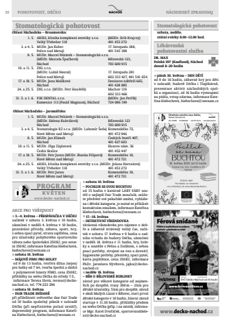30 POHOTOVOST, D%u00c9%u010cKO N%u00c1CHODSK%u00dd ZPRAVODAJStomatologick%u00e1 pohotovostsobota, ned%u011ble, st%u00e1tn%u00ed sv%u00e1tky 8.00%u201312.00 hod.Stomatologick%u00e1 pohotovostL%u00e9k%u00e1rensk%u00e1 pohotovostn%u00ed slu%u017eba www.decko-nachod.czDR. MAXPolsk%u00e1 397 (Kaufland), N%u00e1choddenn%u011b 8%u201320 hodinKV%u011aTENPROGRAMwww.decko%u2013nachod.czAKCE PRO VE%u0158EJNOST3.%u20134. kv%u011btna %u2013 P%u0158ESP%u00c1VA%u010cKA V D%u00c9%u010cKU za%u010d%u00e1tek v sobotu 3. kv%u011btna v 10 hodin, ukon%u010den%u00ed v ned%u011bli 4. kv%u011btna v 10 hodin, pozn%u00e1v%u00e1n%u00ed p%u0159%u00edrody, z%u00e1bava, sport, hry, s sebou spac%u00ed pytel, strava zaji%u0161t%u011bna, cena pro %u00fa%u010dastn%u00edky pohybov%u00e9ho sportovn%u00edho t%u00e1bora nebo Spr%u00e1v%u0148%u00e1k%u016f 250K%u010d, pro ostatn%u00ed 350K%u010d, informace Kate%u0159ina Hiebschov%u00e1, hiebschova@seznam.czsobota 10. kv%u011btna %u2013 M%u00c1JOV%u00c9 FIMO PRO HOLKY od 9 do 13 hodin, tvo%u0159iv%u00e1 d%u00edlna /nejen/ pro holky od 7 let, tvorba %u0161perk%u016f a d%u00e1rk%u016f z polymerov%u00e9 hmoty FIMO, cena 250K%u010d, p%u0159ihl%u00e1%u0161ky na webu D%u00e9%u010dka do st%u0159edy 7.5., informace Tereza I%u0161ov%u00e1, tereza@deckonachod.cz, tel. 774 223 296sobota 10. kv%u011btna %u2013 FAIR TRADE SN%u00cdDAN%u011ap%u0159i p%u0159%u00edle%u017eitosti sv%u011btov%u00e9ho dne Fair Trade od 10 hodin spole%u010dn%u00fd piknik v zahrad%u011b D%u00e9%u010dka (p%u0159i nep%u0159%u00edzniv%u00e9m po%u010das%u00ed uvnit%u0159), doprovodn%u00fd program, informace Kate%u0159ina Hiebschov%u00e1, hiebschova@seznam.czsobota 10. kv%u011btna %u2013 POCHLUB SE SVOU BUCHTOUod 15 hodin v kav%u00e1rn%u011b L%u00c1RY F%u00c1RY sout%u011b%u017e o nejlep%u0161%u00ed Fair Trade mou%u010dn%u00edk, m%u016f%u017eete p%u0159edv%u00e9st sv%u00e9 peka%u0159sk%u00e9 um%u011bn%u00ed, vyhl%u00e1%u0161ena i d%u011btsk%u00e1 kategorie, je nutn%u00e9 se p%u0159ihl%u00e1sit kontaktn%u00edm emailem, informace Kate%u0159ina Hiebschov%u00e1, hiebschova@seznam.cz17.%u201318. kv%u011btna %u2013 DETEKTIVN%u00cd V%u00cdKENDOVKA zkr%u00e1cen%u00e1 v%u00edkendovka pro z%u00e1jemce o dob%u0159e a z%u00e1bavn%u011b str%u00e1ven%u00fd voln%u00fd %u010das, za%u010d%u00e1tek v sobotu 17. kv%u011btna v 9 hodin u zadn%u00edho vchodu do budovy D%u00e9%u010dka, ukon%u010den%u00ed v ned%u011bli 18. kv%u011btna v 11 hodin, hry, hr%u00e1tky a sout%u011b%u017ee s P%u00e9%u0165ou a Dal%u00edkem, s sebou psac%u00ed pot%u0159eby, strojen%u00ed na ven a dovnit%u0159, hygienick%u00e9 pot%u0159eby, p%u0159ez%u016fvky, spac%u00ed pytel, karta poji%u0161t%u011bnce, cena 350K%u010d, informace PhDr. Jaroslava N%u00fdvltov%u00e1, jajka@deckonachod.czned%u011ble 18. kv%u011btna %u2013 B%u011aH O B%u011aLOVESK%u00c9 BUBLINKYz%u00e1vod pro v%u011bkov%u00e9 kategorie od nejmen%u0161%u00edch po dosp%u011bl%u00e9, trasy 300m %u2013 2 km pro d%u011btsk%u00e9 %u00fa%u010dastn%u00edky, 5 km pro dosp%u011bl%u00e9, z%u00e1vod v okol%u00ed Mal%u00fdch L%u00e1zn%u00ed v B%u011blovsi, start prvn%u00ed d%u011btsk%u00e9 kategorie v 10 hodin, hlavn%u00ed z%u00e1vod startuje v 11.30 hodin, p%u0159ihl%u00e1%u0161ky p%u0159edem na webu D%u00e9%u010dka (p%u0159%u00edp. i na m%u00edst%u011b), informace Mgr. Karel Dvo%u0159%u00e1%u010dek, sportovnioddeleni@decko-nachod.cz Oblast N%u00e1chodsko %u2013 Broumovsko:1. 5. ARIES, klinika komplexn%u00ed estetiky s.r.o. (MDDr. Erik Krajczy)Velk%u00fd T%u0159ebe%u0161ov 118 491 453 2723. a 4. 5. MUDr. Jan Kubec 17. listopadu 388, Police nad Metuj%u00ed 491 543 3988. 5. MUDr. Marcel Pek%u00e1rek %u2013 Stomatologick%u00e1 s.r.o. (MDDr. Marcela %u0160pa%u010dkov%u00e1) B%u011blovesk%u00e1 123,N%u00e1chod 703 600 91510. a 11. 5. ZNL s.r.o. (MUDr. Luk%u00e1%u0161 Neoral) 17. listopadu 291Police nad Metuj%u00ed 602 333 427, 491 541 65417. a 18. 5. MUDr. Jana Mal%u00edkov%u00e1 Denisovo n%u00e1b%u0159e%u017e%u00ed 665,N%u00e1chod 491 428 88524. a 25. 5. ZNL s.r.o. (MUDr. Petr Hou%u0161t%u011bk) Machov 119 602 333 46631. 5. a 1. 6. P3K DENTAL s.r.o. (MDDr. Jan Pet%u0159%u00edk)Kamenice 113 (Pas%u00e1%u017e Magnum), N%u00e1chod 724 086 199Oblast N%u00e1chodsko %u2013 Jarom%u011b%u0159sko:1. 5. MUDr. Marcel Pek%u00e1rek %u2013 Stomatologick%u00e1 s.r.o. (MDDr. Helena Kukr%u00e1lov%u00e1) B%u011blovesk%u00e1 123N%u00e1chod 703 600 9153. a 4. 5. Stomatologie RZ s.r.o. (MDDr. Lubom%u00edr %u0160eda) Komensk%u00e9ho 72,Nov%u00e9 M%u011bsto nad Metuj%u00ed 491 472 9468. 5. MUDr. Jan Klimek %u010cesk%u00fdch brat%u0159%u00ed 407,N%u00e1chod 491 427 60310. a 11. 5. MUDr. Olga Z%u00e1platov%u00e1 Husovo n%u00e1m. 36%u010cesk%u00e1 Skalice 491 452 44717. a 18. 5. MUDr. Petr Juran (MUDr. Blanka Filipov%u00e1) Komensk%u00e9ho 10,Nov%u00e9 M%u011bsto nad Metuj%u00ed 491 472 72124. a 25. 5. ARIES, klinika komplexn%u00ed estetiky s.r.o. (MUDr. Jolana Nezvalov%u00e1)Velk%u00fd T%u0159ebe%u0161ov 118 491 453 27231. 5. a 1. 6. MUDr. Petr Juran Komensk%u00e9ho 10,Nov%u00e9 M%u011bsto nad Metuj%u00ed 491 472 721p%u00e1tek 30. kv%u011btna %u2013 DEN D%u011aT%u00cdod 9 do 16 hodin, z%u00e1bavn%u00e9 hry pro d%u011bti v zahrad%u011b, budov%u011b D%u00e9%u010dka i Tlap%u00edk%u00e1rn%u011b, prezentace aktivit n%u00e1chodsk%u00fdch spolk%u016f a organizac%u00ed, od 16 hodin vystoupen%u00ed na p%u00f3diu, vstup zdarma, informace Kate%u0159ina Hiebschov%u00e1, hiebschova@seznam.cz