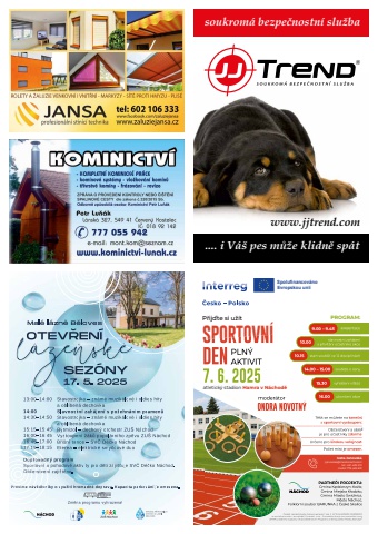 .... i V%u00e1%u0161 pes m%u016f%u017ee klidn%u011b sp%u00e1tsoukrom%u00e1 bezpe%u010dnostn%u00ed slu%u017ebawww.jjtrend.comzpravodaj 20177. prosince 2016 9:22:5413:00%u201314:0014:0014:30%u201314:5015:15%u201315:4516:00%u201316:4516:45%u201317:0017:15%u201318:15Stavostrojka %u2013 zn%u00e1m%u00e9 muzik%u00e1lov%u00e9 i oldies hitya obl%u00edben%u00e1 dechovkaSlavnostn%u00ed zah%u00e1jen%u00ed s po%u017eehn%u00e1n%u00edm pramen%u016fStavostrojka %u2013 zn%u00e1m%u00e9 muzik%u00e1lov%u00e9 i oldies hitya obl%u00edben%u00e1 dechovkaRytmizol %u2013 dechov%u00fd orchestr ZU%u0160 N%u00e1chodVystoupen%u00ed %u017e%u00e1k%u016f popul%u00e1rn%u00edho zp%u011bvu ZU%u0160 N%u00e1chodB%u0159i%u0161n%u00ed tance %u2013 SV%u010c D%u00e9%u010dko N%u00e1chodEterea %u2013 elektrick%u00e9 smy%u010dcov%u00e9 duoDoprovodn%u00fd programSportovn%u00ed a pohodov%u00e9 aktivity pro d%u011bti zaji%u0161%u0165uje SV%u010c D%u00e9%u010dko N%u00e1chod.Ob%u010derstven%u00ed zaji%u0161t%u011bno.Pros%u00edme n%u00e1v%u0161t%u011bvn%u00edky o vyu%u017eit%u00ed hromadn%u00e9 dopravy. Kapacita parkov%u00e1n%u00ed je omezena.Zm%u011bna programu vyhrazena!l%u00e1ze%u0148sk%u00e9Mal%u00e9 l%u00e1zn%u011b B%u011bloves17. 5. 2025SEZ%u00d3NYOTEV%u0158EN%u00cd13:00%u201314:0014:0014:30%u201314:5015:15%u201315:4516:00%u201316:4516:45%u201317:0015Stavostrojka %u2013 zn%u00e1m%u00e9 muzik%u00e1lov%u00e9 i oldies hitya obl%u00edben%u00e1 dechovkaSlavnostn%u00ed zah%u00e1jen%u00ed s po%u017eehn%u00e1n%u00edm pramen%u016fStavostrojka %u2013 zn%u00e1m%u00e9 muzik%u00e1lov%u00e9 i oldies hitya obl%u00edben%u00e1 dechovkaRytmizol %u2013 dechov%u00fd orchestr ZU%u0160 N%u00e1chodVystoupen%u00ed %u017e%u00e1k%u016f popul%u00e1rn%u00edho zp%u011bvu ZU%u0160 N%u00e1chodB%u0159i%u0161n%u00ed tance %u2013 SV%u010c D%u00e9%u010dko N%u00e1chodEterea %u2013 elektrick%u00e9 smy%u010dcov%u00e9 duon%u00fd programa pohodov%u00e9 aktivity pro d%u011bti zaji%u0161%u0165uje SV%u010c D%u00e9%u010dko N%u00e1chod.n%u00ed zaji%u0161t%u011bno.%u00edky o vyu%u017eit%u00ed hromadn%u00e9 dopravy. Kapacita parkov%u00e1n%u00ed je omezena.Zm%u011bna programu vyhrazena!l%u00e1ze%u0148sk%u00e9Mal%u00e9 l%u00e1zn%u011b B%u011bloves1z7. 5. 2025SzEZ%u00d3%u0148NYOl TEV%u0158EN%u00cdsk%u00e9s%u00cdsk%u00e917:15%u201318:1DoprovodnSportovn%u00ed aOb%u010derstvenPros%u00edme n%u00e1v%u0161t%u011bvn%u00edSpolufinancov%u00e1noEvropskou uni%u00edSPORTOVN%u00cd DENP%u0159ij%u010fte si u%u017e%u00edtT%u011b%u0161it se m%u016f%u017eete na tane%u010dn%u00ed a sportovn%u00ed vystoupen%u00ed.Ob%u010derstven%u00ed a ob%u011bd je pro %u00fa%u010dastn%u00edky zdarma. Ur%u010deno pro %u0161irokou ve%u0159ejnost. Po%u010det m%u00edst je omezen.Projekt %u201eSpole%u010dn%u011b p%u0159es hranice generac%u00ed%u201c, reg. %u010d. CZ.11.04.02/00/23_003/0000111 je spolufi nancov%u00e1n z prost%u0159edk%u016f Evropsk%u00e9- unie %u2013 Evropsk%u00e9ho fondu pro region%u00e1ln%u00ed rozvoj (EFRR) a st%u00e1tn%u00edho rozpo%u010dtu %u010cR prost%u0159ednictv%u00edm Programu Interreg %u010cesko-Polsko 2021-2027.%u00a0 PLN%u00dd AKTIVIT7. 6. 2025PROGRAM:slavnostn%u00ed zah%u00e1jen%u00ed a p%u0159%u00edv%u00edt%u00e1n%u00ed %u00fa%u010dastn%u00edk%u016f akcestart sout%u011b%u017e%u00ed ve 12 discipl%u00edn%u00e1chprezentacesout%u011b%u017ee o cenyvyhl%u00e1%u0161en%u00ed v%u00edt%u011bz%u016fukon%u010den%u00ed akce10.0010.159.00 %u2013 9.4514.00 %u2013 15.0015.3016.00SPORTOVN%u00cd DENT%u011b%u0161it se m%u016f%u017eete na tane%u010dn%u00ed a sportovn%u00ed vystoupen%u00edOb%u010derstven%u00ed a ob%u011bd je pro %u00fa%u010dastn%u00edky zdarmaUr%u010deno pro %u0161irokou ve%u0159ejnostPo%u010det m%u00edst je omezenProjekt %u201eSpole%u010dn%u011b p%u0159es hranice generac%u00ed%u201c, reg. %u010d. CZ.11.04.02/00/23_003/0000111 je spolufi nancov%u00e1n z prost%u0159edk%u016f Evropsk%u00e9- unie %u2013 Evropsk%u00e9ho fondu pro region%u00e1ln%u00ed rozvoj (EFRR) a st%u00e1tn%u00edho rozpo%u010dtu %u010cR prost%u0159ednictv%u00edm Programu Interreg %u010cesko-Polsko 2021-2027.%u00a0 PLN%u00dd AKTIVIT7. 6. 2025slavnostn%u00ed zah%u00e1jen%u00ed a p%u0159%u00edv%u00edt%u00e1n%u00ed %u00fa%u010dastn%u00edk%u016f akcestart sout%u011b%u017e%u00ed ve 12 discipl%u00edn%u00e1chprezentacesout%u011b%u017ee o cenyvyhl%u00e1%u0161en%u00ed v%u00edt%u011bz%u016fukon%u010den%u00ed akce10.0010.1514.00 %u2013 15.0015.3016.00Iveta Janovsk%u00e1 i.janovska@mestonachod.cztel.: 491 405 210mobil: 778%u00a0425 831atletick%u00fd stadion Hamra v N%u00e1chod%u011b