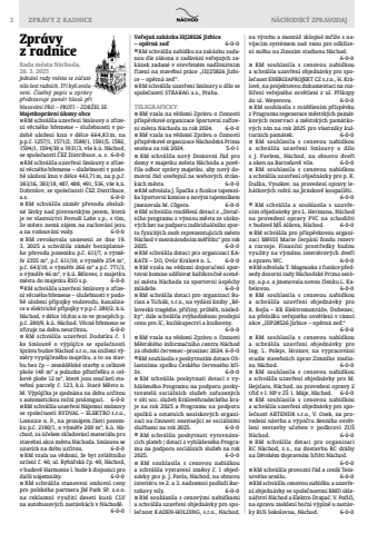 2 ZPR%u00c1VY Z RADNICE N%u00c1CHODSK%u00dd ZPRAVODAJZpr%u00e1vy z radniceRada m%u011bsta N%u00e1choda, 26. 3. 2025Jedn%u00e1n%u00ed rady m%u011bsta se z%u00fa%u010dastnilo %u0161est radn%u00edch. T%u0159i byli omluveni. %u010c%u00edseln%u00fd popis u zpr%u00e1vy p%u0159edstavuje pom%u011br hlas%u016f p%u0159i hlasov%u00e1n%u00ed PRO %u2013 PROTI %u2013 ZDR%u017dEL SE.Majetkopr%u00e1vn%u00ed %u00fakony obce RM schv%u00e1lila uzav%u0159en%u00ed Smlouvy o z%u0159%u00edzen%u00ed v%u011bcn%u00e9ho b%u0159emene %u2013 slu%u017eebnosti v podob%u011b ulo%u017een%u00ed knn v d%u00e9lce 664,83m, nap.p.%u010d. 1257/1, 1571/2, 1589/1, 1591/5, 1592, 1594/1, 1594/30 a 1931/3, v%u0161e k.%u00fa. N%u00e1chod, se spole%u010dnost%u00ed %u010cEZ Distribuce, a. s. 6-0-0 RM schv%u00e1lila uzav%u0159en%u00ed Smlouvy o z%u0159%u00edzen%u00ed v%u011bcn%u00e9ho b%u0159emene %u2013 slu%u017eebnosti v podob%u011b ulo%u017een%u00ed knn v d%u00e9lce 443,71m, na p.p.%u010d. 383/16, 383/18, 487, 488, 491, 516, v%u0161e k.%u00fa. Dobro%u0161ov, se spole%u010dnost%u00ed %u010cEZ Distribuce, a.s. 6-0-0 RM schv%u00e1lila z%u00e1m%u011br p%u0159evodu obslu%u017en%u00e9 l%u00e1vky nad pivovarsk%u00fdm jezem, kter%u00e1 je ve vlastnictv%u00ed Povod%u00ed Labe s.p., s t%u00edm, %u017ee m%u011bsto nem%u00e1 z%u00e1jem na zachov%u00e1n%u00ed jezu a na vzdouv%u00e1n%u00ed vody. 6-0-0 RM revokovala usnesen%u00ed ze dne 19. 3. 2025 a schv%u00e1lila z%u00e1m%u011br bez%u00faplatn%u00e9ho p%u0159evodu pozemku p.%u010d. 611/7, o v%u00fdm%u011b%u0159e 2355 m2, p.%u010d. 611/10, o v%u00fdm%u011b%u0159e 254 m2, p.%u010d. 643/10, o v%u00fdm%u011b%u0159e 266 m2 a p.%u010d. 771/3, o v%u00fdm%u011b%u0159e 46 m2, v k.%u00fa. B%u011bloves, z majetku m%u011bsta do majetku %u0158SD s.p. 6-0-0 RM schv%u00e1lila uzav%u0159en%u00ed Smlouvy o z%u0159%u00edzen%u00ed v%u011bcn%u00e9ho b%u0159emene %u2013 slu%u017eebnosti v podob%u011b ulo%u017een%u00ed p%u0159%u00edpojky vodovodu, kanalizace a elektrick%u00e9 p%u0159%u00edpojky v p.p.%u010d. 280/2, k.%u00fa. N%u00e1chod, v d%u00e9lce 10,8m a to ve prosp%u011bch p.p.%u010d. 280/9, k.%u00fa. N%u00e1chod. V%u011bcn%u00e9 b%u0159emeno se z%u0159izuje na dobu neur%u010ditou. 6-0-0 RM schv%u00e1lila uzav%u0159en%u00ed Dodatku %u010d. 1 ke Smlouv%u011b o v%u00fdp%u016fj%u010dce se spole%u010dnost%u00ed Spr%u00e1va budov N%u00e1chod s.r.o., na sn%u00ed%u017een%u00ed v%u00fdm%u011bry vyp%u016fj%u010den%u00e9ho majetku, a to na stavbu bez %u010dp %u2013 zem%u011bd%u011blsk%u00e9 stavby o celkov%u00e9 plo%u0161e 140 m2 a jednoho p%u0159%u00edst%u0159e%u0161ku o celkov%u00e9 plo%u0161e 12 m2, kter%u00e9 jsou sou%u010d%u00e1st%u00ed stavebn%u00ed parcely %u010d. 123, k.%u00fa. Star%u00e9 M%u011bsto n. M. V%u00fdp%u016fj%u010dka je sjedn%u00e1na na dobu ur%u010ditou s automatickou ro%u010dn%u00ed prolongac%u00ed. 6-0-0 RM schv%u00e1lila uzav%u0159en%u00ed N%u00e1jemn%u00ed smlouvy se spole%u010dnost%u00ed RYDVAL %u2013 ELEKTRO s.r.o., Lomnice n. P., na pron%u00e1jem %u010d%u00e1sti pozemku p.%u010d. 2190/1, o v%u00fdm%u011b%u0159e 200 m2, k.%u00fa. N%u00e1chod, za %u00fa%u010delem skladov%u00e1n%u00ed materi%u00e1lu pro stavebn%u00ed akce m%u011bsta N%u00e1choda. Smlouva se uzav%u00edr%u00e1 na dobu ur%u010ditou. 6-0-0 RM vzala na v%u011bdom%u00ed, %u017ee byt zvl%u00e1%u0161tn%u00edho ur%u010den%u00ed %u010d. 40, ul. Ryb%u00e1%u0159sk%u00e1 %u010dp. 40, N%u00e1chod, v budov%u011b Harmonie I. bude k dispozici pro dal%u0161%u00ed n%u00e1jemn%u00edky. 6-0-0 RM schv%u00e1lila stanoven%u00ed smluvn%u00ed ceny pro polsk%u00e9ho partnera JM Park SP, z.o.o. na reklamn%u00ed vyu%u017eit%u00ed deseti kus%u016f CLV na autobusov%u00fdch zast%u00e1vk%u00e1ch v N%u00e1chod%u011b.6-0-0Ve%u0159ejn%u00e1 zak%u00e1zka III/28526 Jizbice %u2013 op%u011brn%u00e1 ze%u010f 6-0-0 RM schv%u00e1lila nab%u00eddku na zak%u00e1zku zadanou dle z%u00e1kona o zad%u00e1v%u00e1n%u00ed ve%u0159ejn%u00fdch zak%u00e1zek zadan%u00e9 v otev%u0159en%u00e9m nadlimitn%u00edm %u0159%u00edzen%u00ed na stavebn%u00ed pr%u00e1ce %u201eIII/25826 Jizbice %u2013 op%u011brn%u00e1 ze%u010f%u201c. RM schv%u00e1lila uzav%u0159en%u00ed Smlouvy o d%u00edlo se spole%u010dnost%u00ed STRABAG a.s., Praha.TELEGRAFICKY: RM vzala na v%u011bdom%u00ed Zpr%u00e1vu o %u010dinnosti p%u0159%u00edsp%u011bvkov%u00e9 organizace Sportovn%u00ed za%u0159%u00edzen%u00ed m%u011bsta N%u00e1choda za rok 2024. 6-0-0 RM vzala na v%u011bdom%u00ed Zpr%u00e1vu o %u010dinnosti p%u0159%u00edsp%u011bvkov%u00e9 organizace N%u00e1chodsk%u00e1 Prima sez%u00f3na za rok 2024. 5-0-1 RM schv%u00e1lila nov%u00fd Domovn%u00ed %u0159%u00e1d pro domy v majetku m%u011bsta N%u00e1choda a pov%u011b%u0159ila odbor spr%u00e1vy majetku, aby nov%u00fd domovn%u00ed %u0159%u00e1d uve%u0159ejnil na webov%u00fdch str%u00e1nk%u00e1ch m%u011bsta. 6-0-0 RM odvolala J. %u0160pa%u010dka z funkce tajemn%u00edka Sportovn%u00ed komise a nov%u00fdm tajemn%u00edkem jmenovala M. C%u0151gera. 6-0-0 RM schv%u00e1lila rozd%u011blen%u00ed dotac%u00ed z %u201eDota%u010dn%u00edho programu z v%u00fdnosu m%u011bsta ze s%u00e1zkov%u00fdch her na podporu individu%u00e1ln%u00edho sportu fyzick%u00fdch osob reprezentuj%u00edc%u00edch m%u011bsto N%u00e1chod v mezin%u00e1rodn%u00edm m%u011b%u0159%u00edtku%u201c pro rok 2025. 6-0-0 RM schv%u00e1lila dotaci pro organizaci KARATE %u2013 DO, Dv%u016fr Kr%u00e1lov%u00e9 n. L. 6-0-0 RM vzala na v%u011bdom%u00ed doporu%u010den%u00ed sportovn%u00ed komise ud%u011blovat ka%u017edoro%u010dn%u011b ocen%u011bn%u00ed m%u011bsta N%u00e1choda za sportovn%u00ed %u00fasp%u011bchy ml%u00e1de%u017ee. 6-0-0 RM schv%u00e1lila dotaci pro organizaci Burian a Tich%u00e1k, s.r.o., na vyd%u00e1n%u00ed knihy %u201eB%u011blovesk%u00e1 trag%u00e9die, p%u0159%u00ed%u010diny, pr%u016fb%u011bh, n%u00e1sledky%u201c, d%u00e1le schv%u00e1lila zv%u00fdhodn%u011bnou prodejn%u00ed cenu pro IC, knihkupectv%u00ed a knihovny. 6-0-0 RM vzala na v%u011bdom%u00ed Zpr%u00e1vu o %u010dinnosti M%u011bstsk%u00e9ho informa%u010dn%u00edho cen